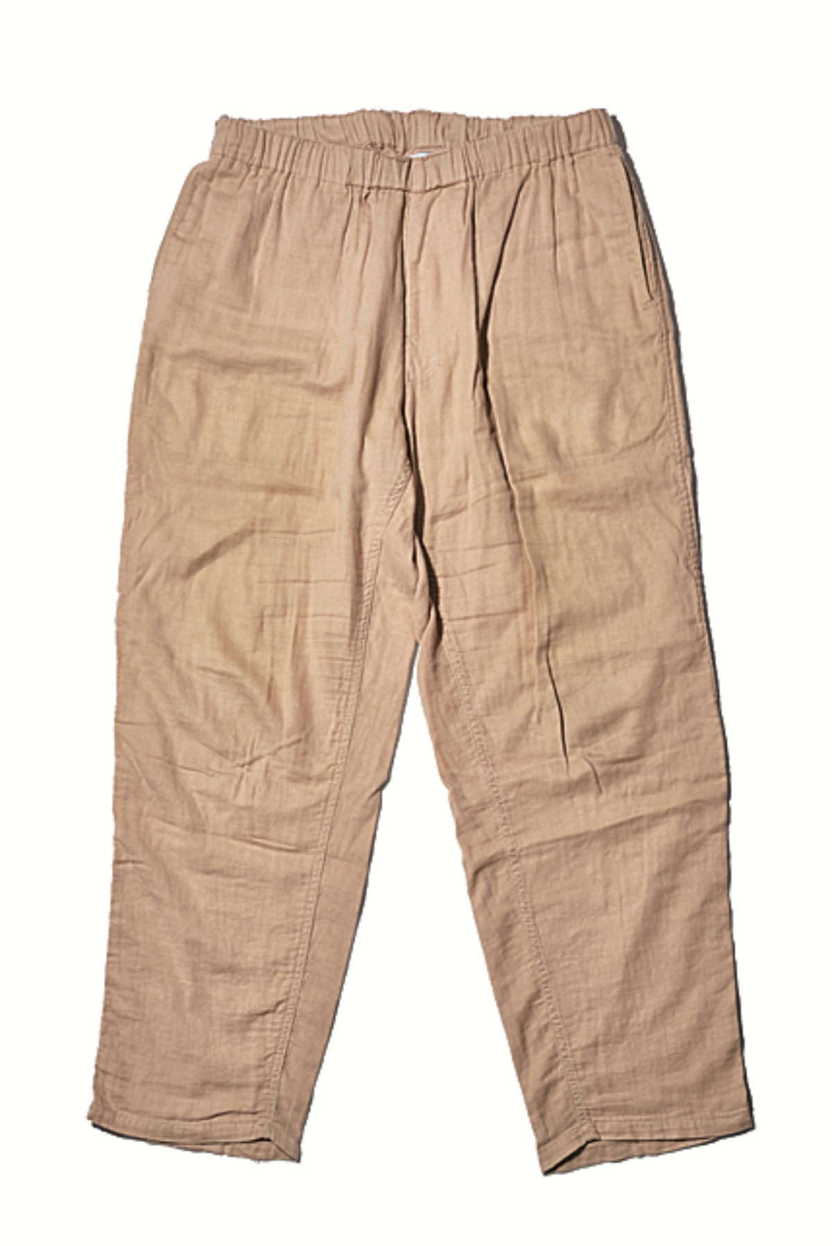 ガーゼ生地で作られたスラックスは、リラックスできる穿き心地が魅力。「体感的にはショーツより涼しい。これは旧モデルですが、4月末発売の新作ではベルトループが付きます」。