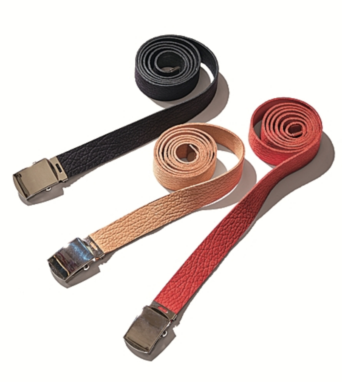 シボ感のあるカウレザーのガチャベルト。「名前の由来は、みんな学生時代に愛用したことがあるガチャベルトを、オトナ向きにレザーで仕上げたから。細さと長さもこだわりです」。