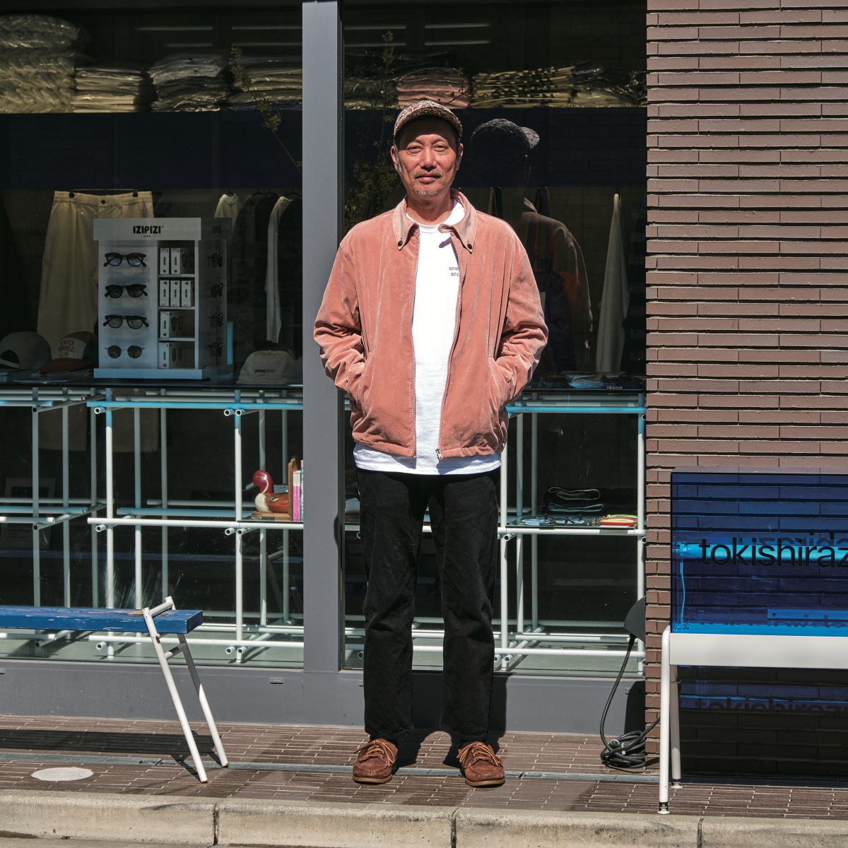 独自のストリートマインドで、90年代から活躍するファッショニスタ。休日はお酒を嗜む日々。「最近は、武蔵小杉の近くにある、スナック以上、キャバクラ未満の“ハイブリッドスナック”にハマっています」。新作のオリジナルアイテムを取り入れた、ラフなプレッピースタイル。「ブルゾンは細部のディテール、パンツはパターンにこだわりました」。コーデュロイブルゾン¥29700、ブラックデニムパンツ¥24200、ドローコードキャップ¥13200、キャップ(私物)/すべてトキシラズ L/S Tシャツ¥6600/ソーメニーブックス. ソーリトルタイム シューズ:4アイレット/セバゴ(私物)