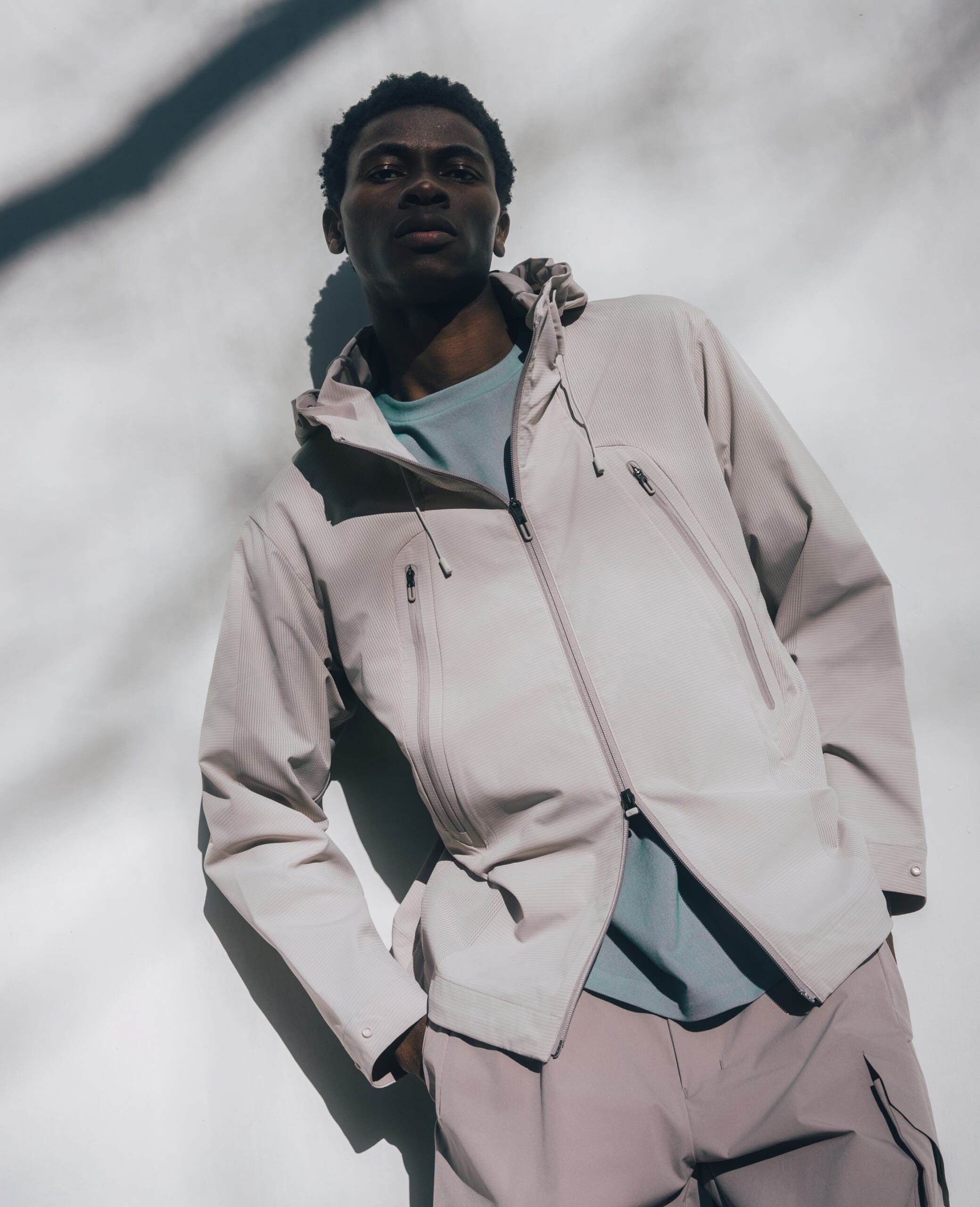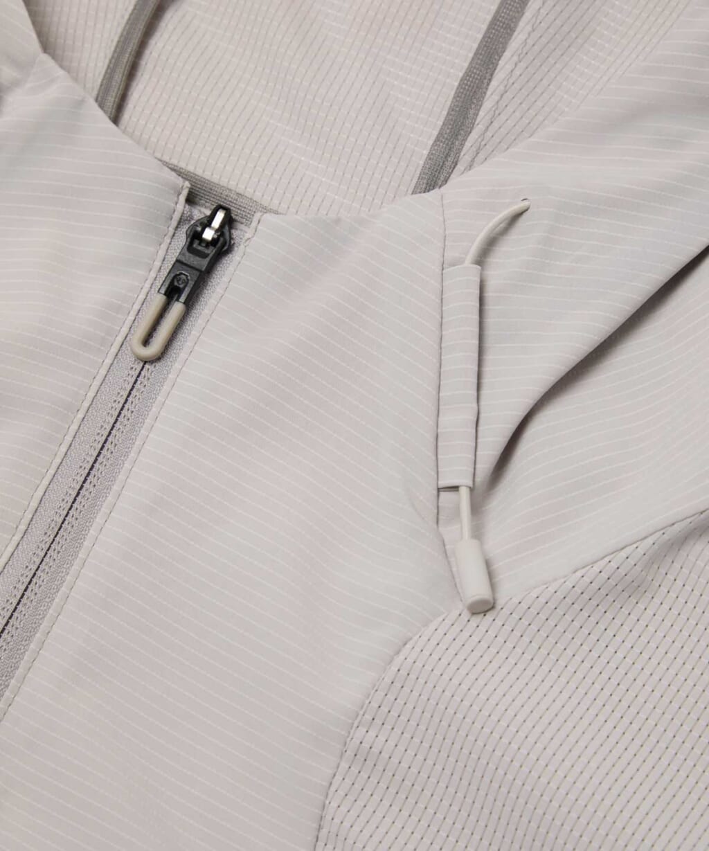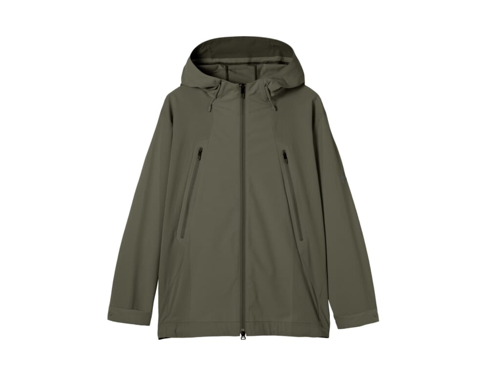 SCHEMATECH GRID AIRを使用したフードジャケット、一枚でも着られる長袖シャツ、そしてワイドシルエットのパンツの定番3種をラインナップ。1枚の生地に特殊メッシュを部分的に配し、体の動きに合わせて効果的に通気を促してくれる。