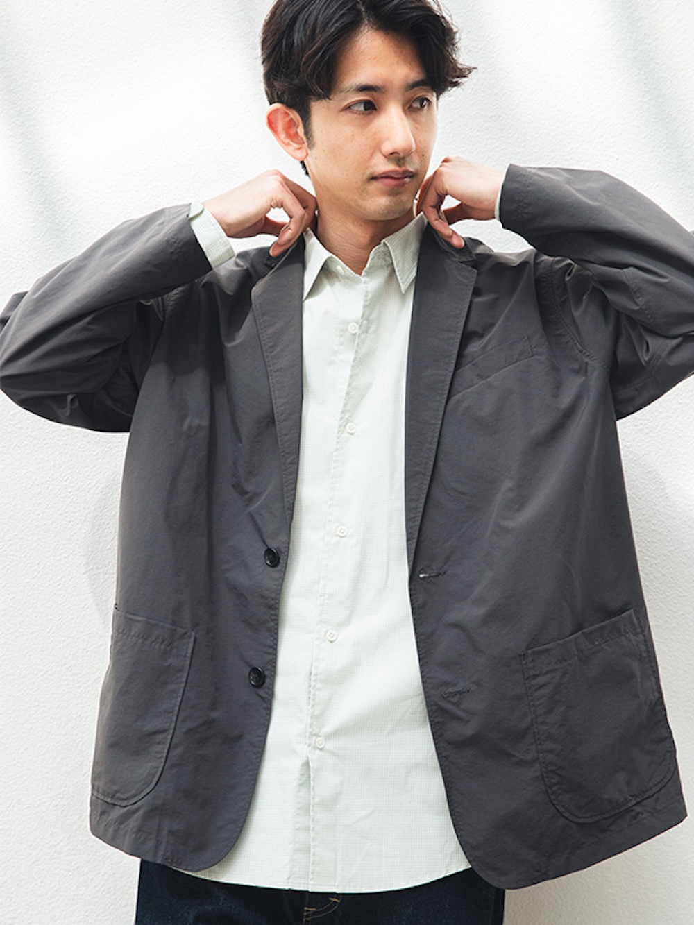 コットンのようなしなやかな風合いながら、軽量、撥水、速乾、UVカットなどの高機能が備わる素材 SupplexNylonを採用したテーラードジャケット。