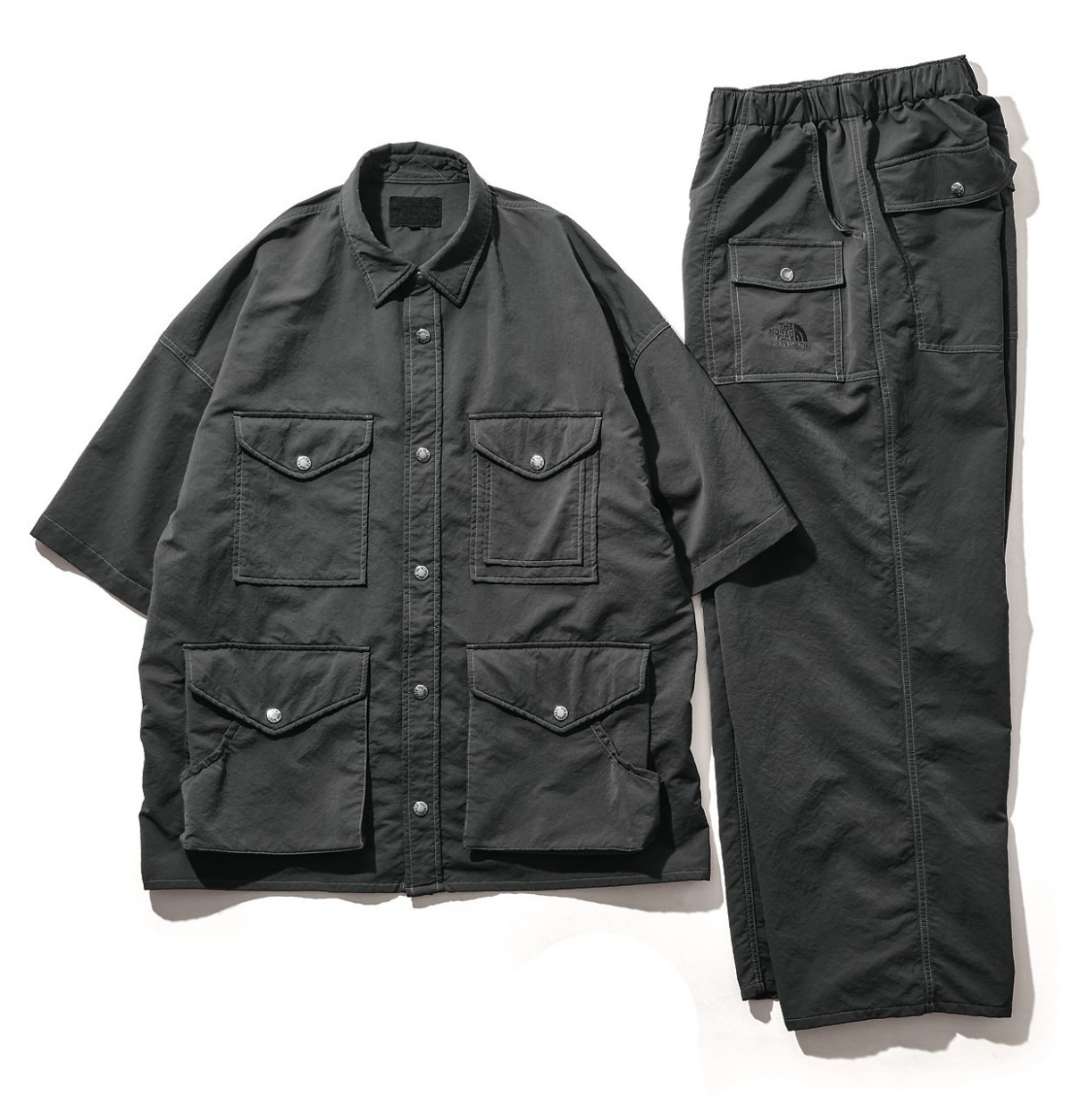 吸汗速乾性、ストレッチ性に優れたアルファドライを使用した半袖シャツとフィールドパンツ。生地に製品染めを施すことにより、着込んだような色味と風合いを表現した。