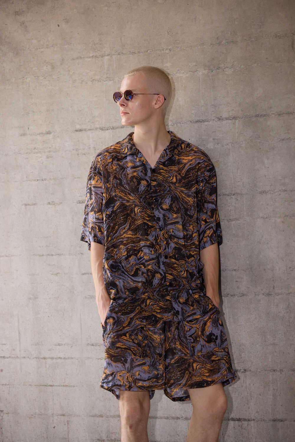 古いアロハ柄の中でも異質な存在感を放つマーブル柄を採用し、50年代のオープンカラーシャツをアップデート。古くは京都の伝統技法”流し”を外国人が持ち帰って、洋服にしたという逸話もあるというパターンはスタイリングの主役にうってつけ。キュプラをメインとした薄手で滑らかな生地感に、コットンとリネンの自然な風合いもプラスした素材を使用しています。