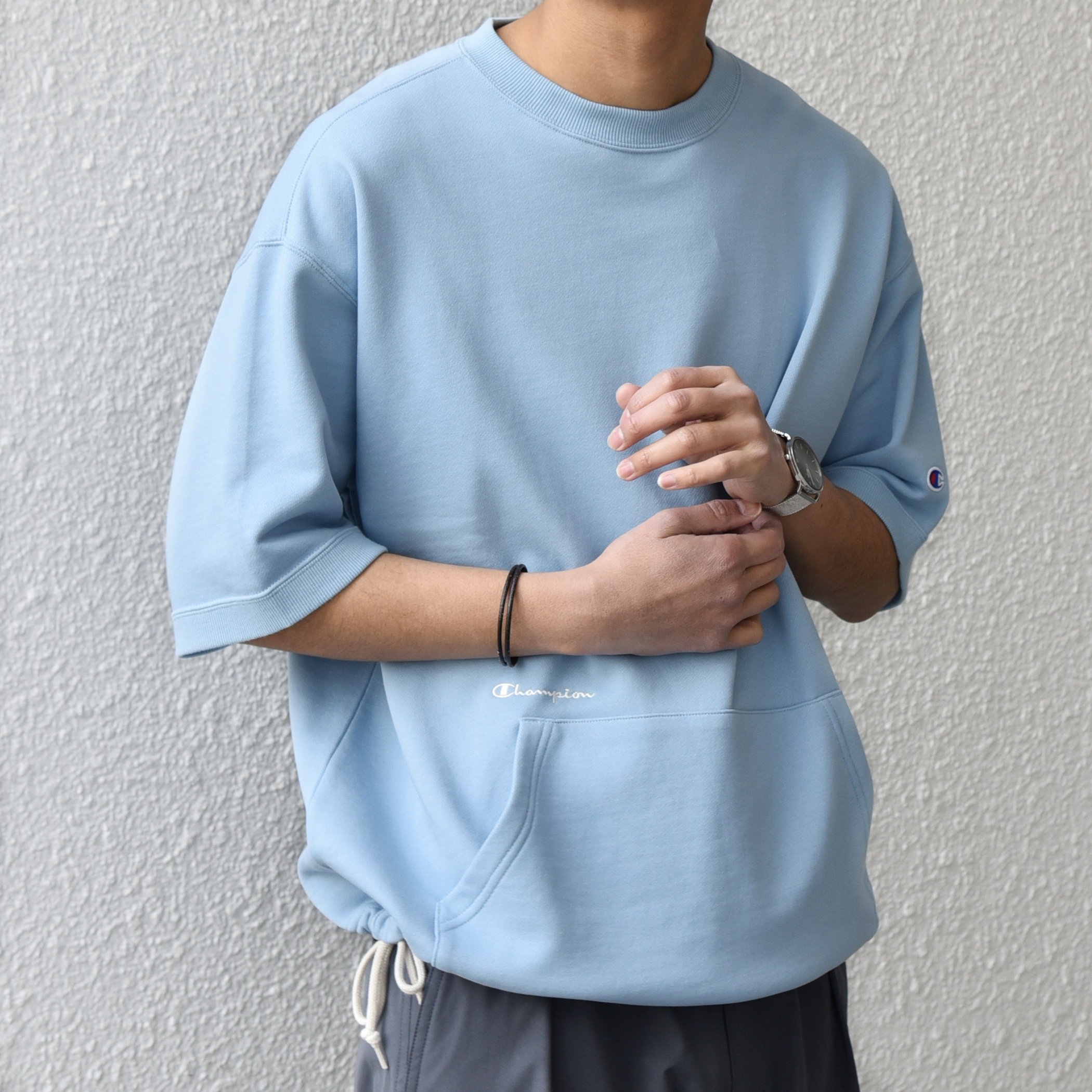 裾部分にドローコードが付属したスウェットTシャツ。左袖のロゴマークに加え、カンガルーポケット上部にはドローコードと同色の「チャンピオン」のスクリプトロゴ刺繍をプラス。程よくゆとりを持たせたボックスシルエットで、幅広いスタイリングに取り入れやすい一着です。