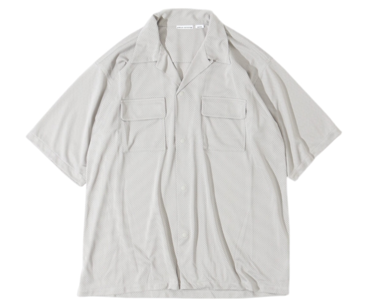 クラシックな開襟シャツをベースに、胸元にはフラップポケットを装着。メッシュボディならではのツヤ感とドレープ感も相まって、袖を通すだけで上品な雰囲気を与えてくれます。