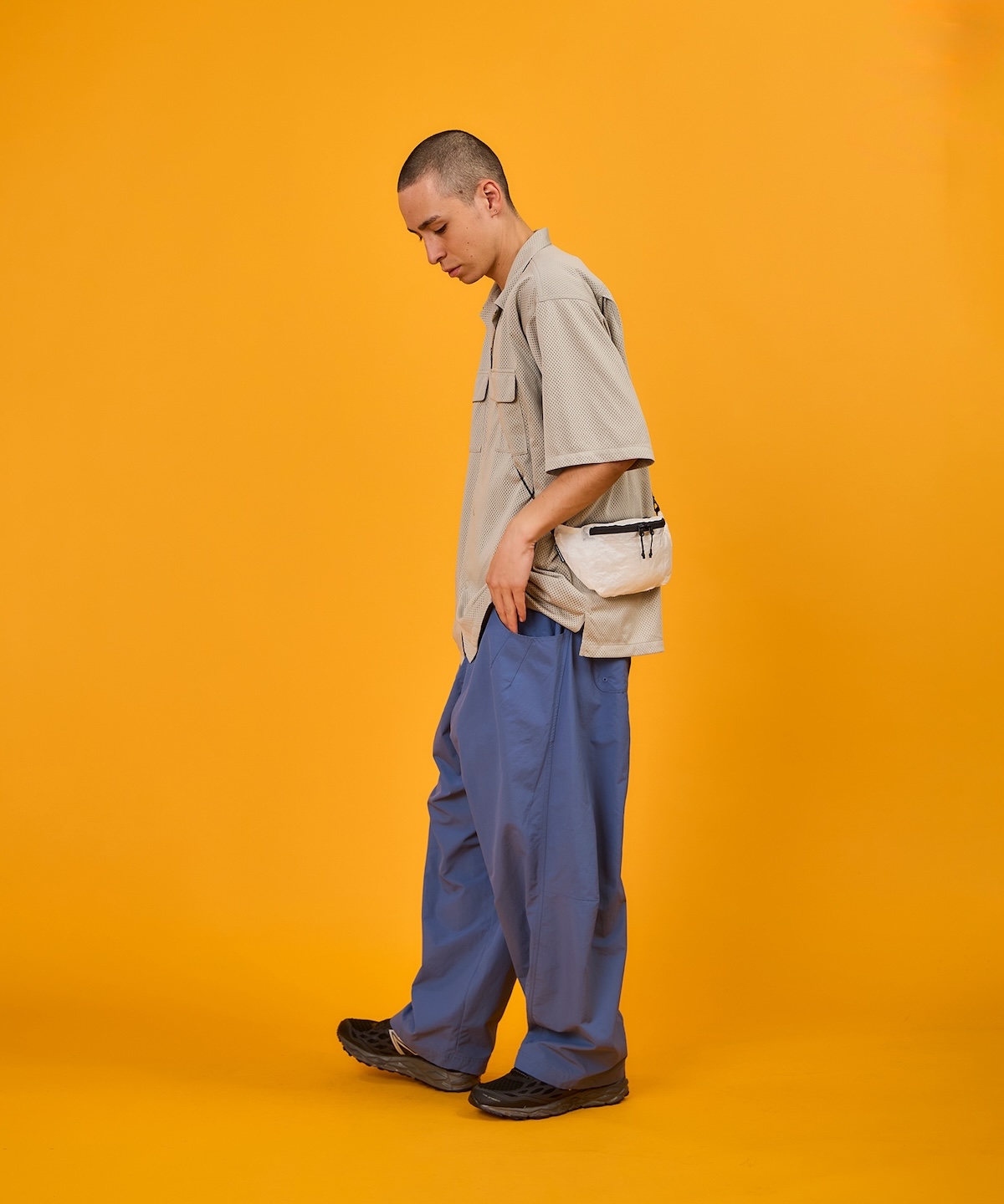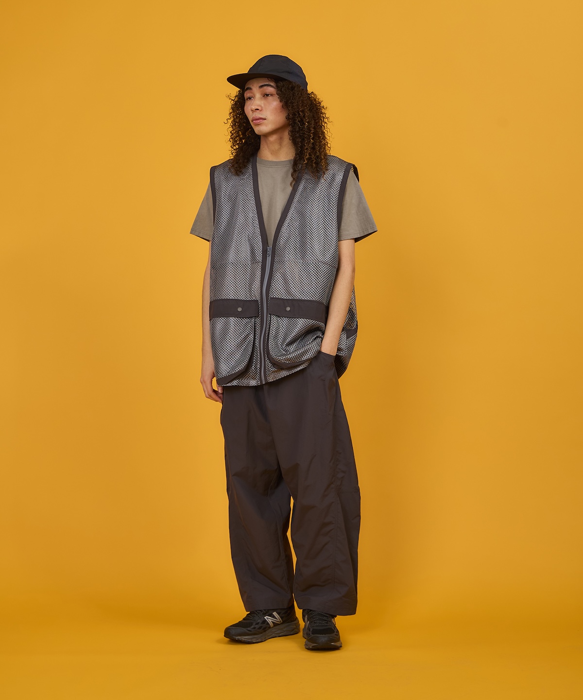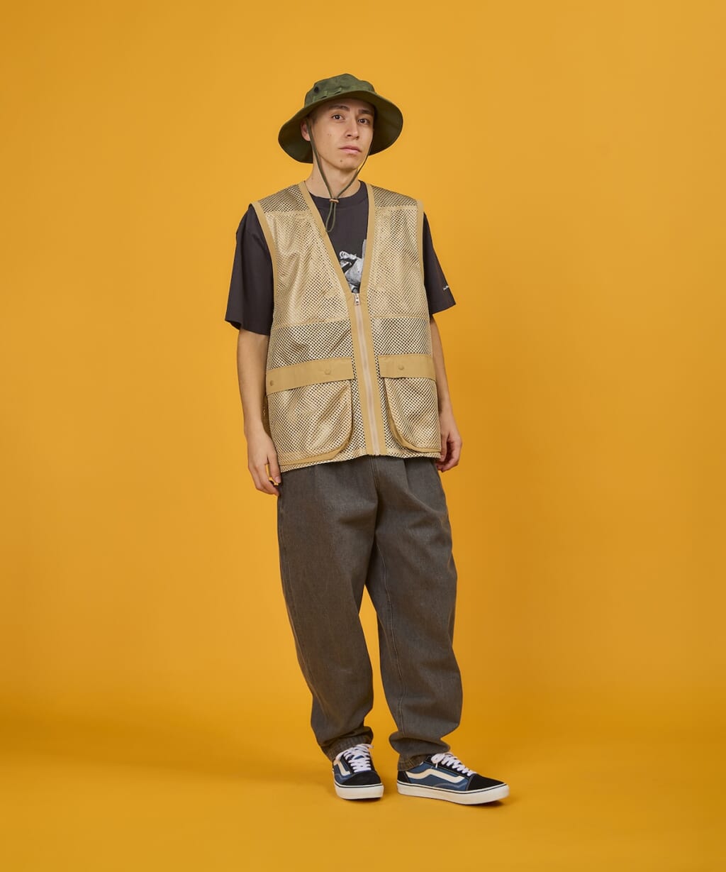 デザインソースとなったフィッシャーマンベストの無骨さを、軽やかな印象を与えるメッシュ地を用いて中和。パイピングにはナチュラルな風合いでありながら、引き裂き強度の高いサプレックスナイロンが施されています。