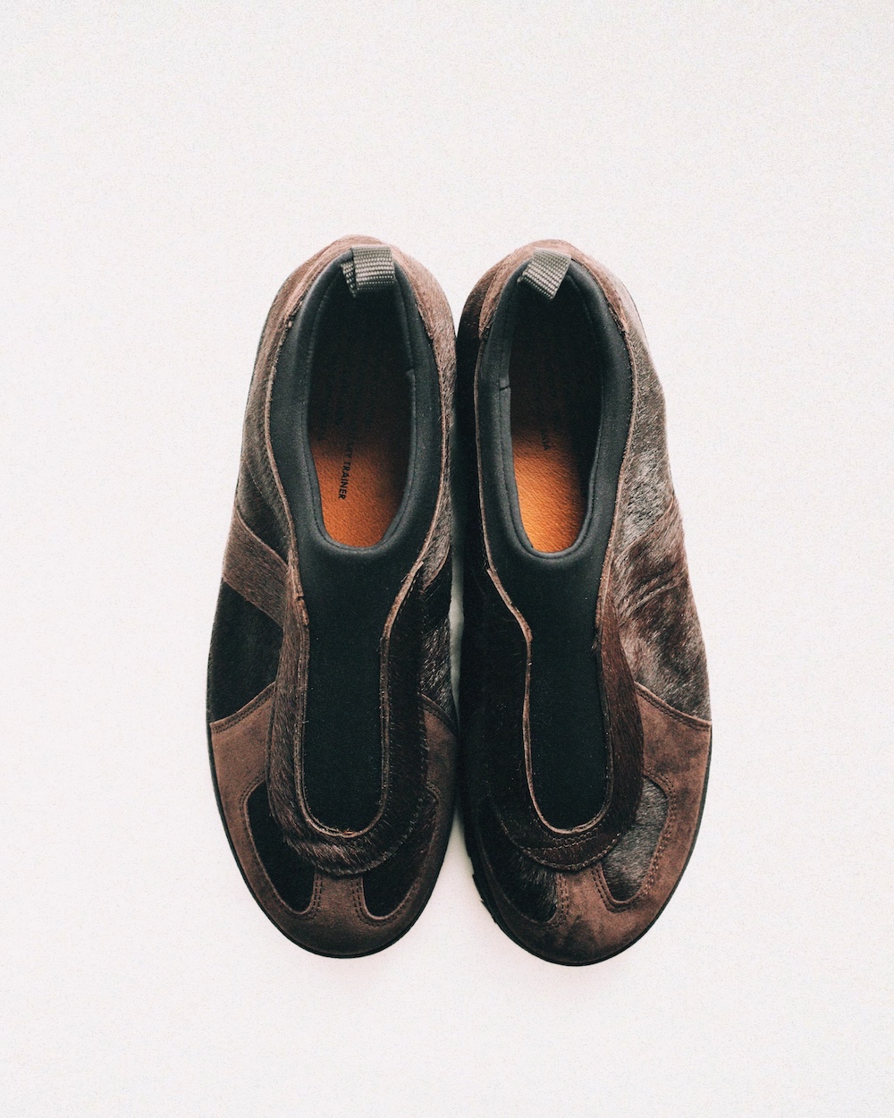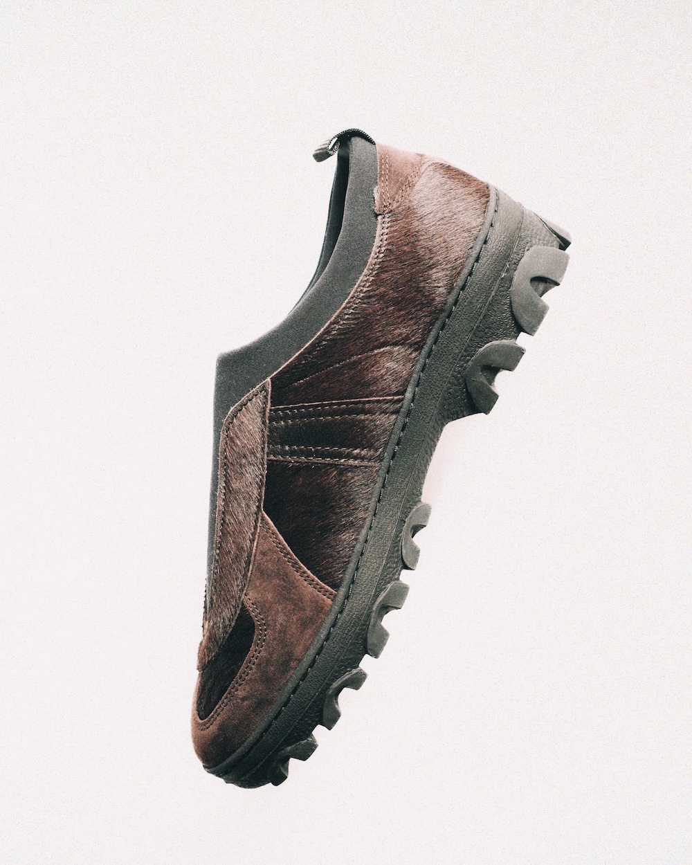 アッパーには、ハラコやスウェードといった上質な素材を用いることで、カジュアルさと品の良さを両立。さらに、トゥにはジャーマントレーナーの要素をさりげなく取り入れることで、ミリタリー、スポーツ、ドレスといった異なる文脈をクロスオーバーした唯一無二の仕上がりに。