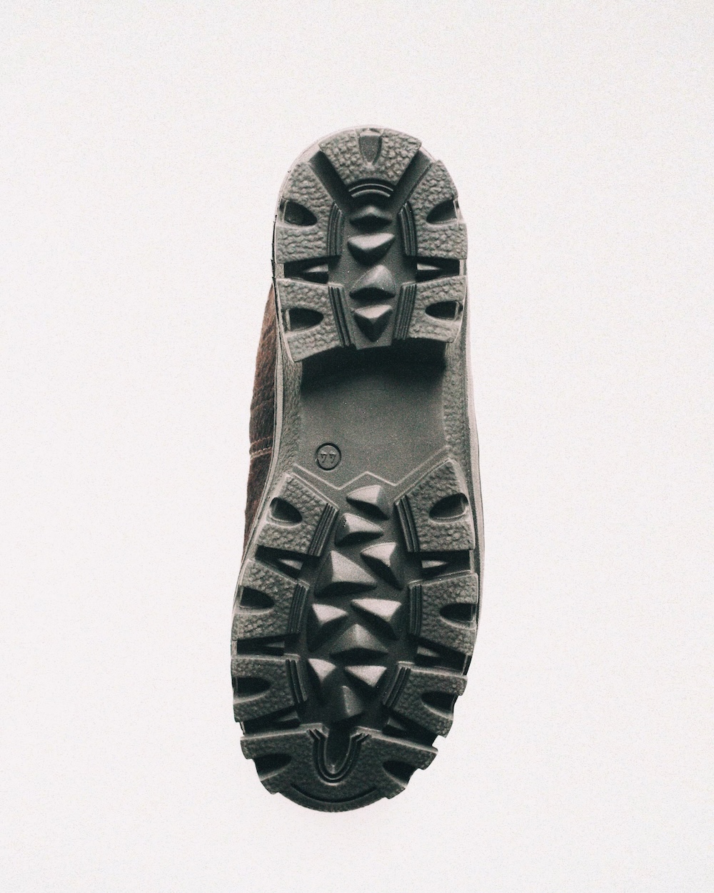 今回スポットが当てられたのは、1970年代よりスロバキアのアウトドアシューズメーカーで使用され、その後も旧ソ連軍のミリタリーシューズにも採用されていた凹凸のあるアウトソール。そこにアメリカのスポーツシューズをベースとしたアッパーデザインを掛け合わせることで、ちょっとした違和感が生まれます。そこが、今回の注目すべきポイントです。