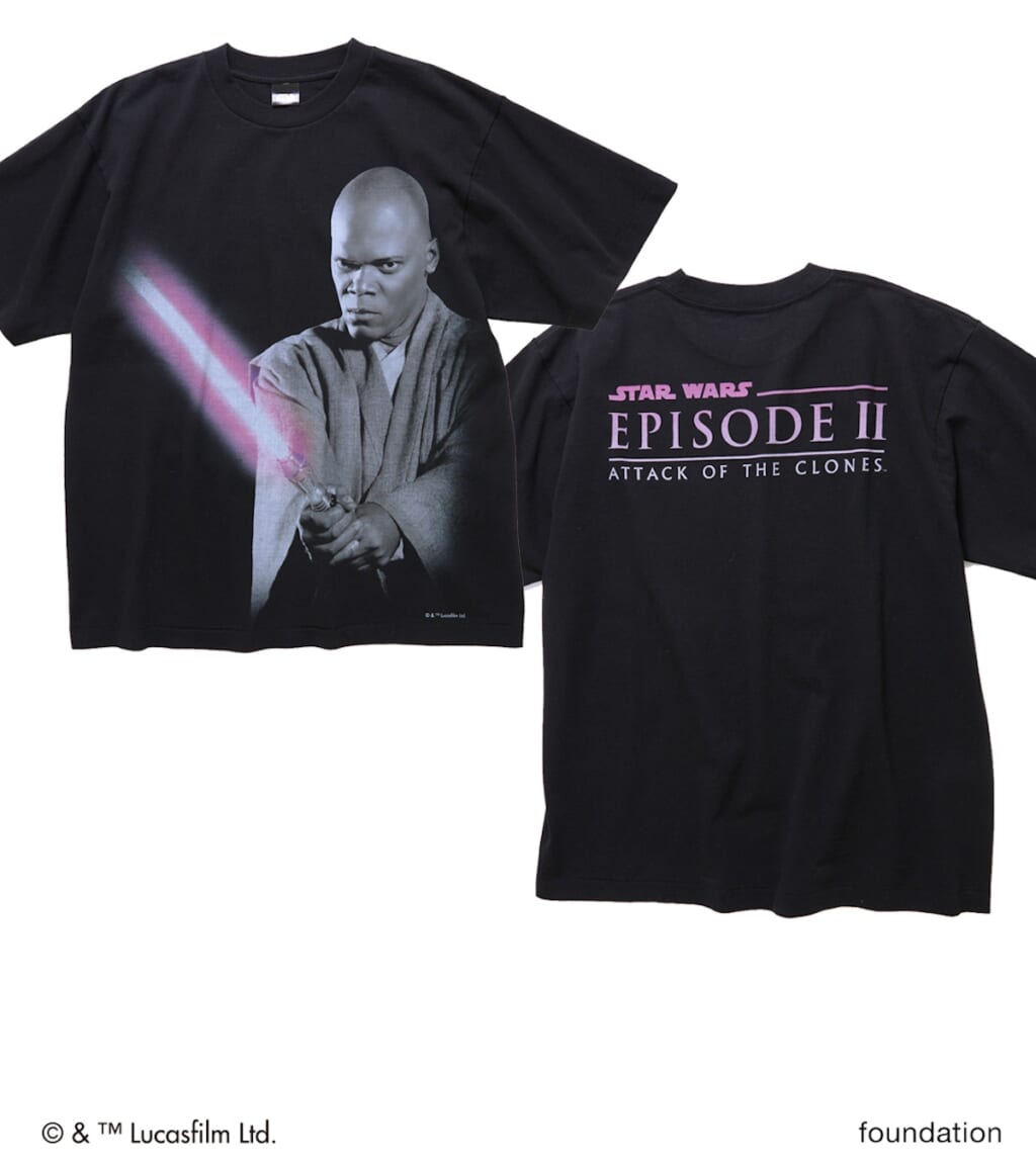『スター・ウォーズ エピソード2/クローンの攻撃』からはサミュエル・L・ジャクソン演じるメイス・ウィンドゥをピックアップ。モノクロベースにライトセーバーの象徴的なパープルだけを輝かせ、バックのロゴもカラーシンクロさせたグラデーションでプリントした。