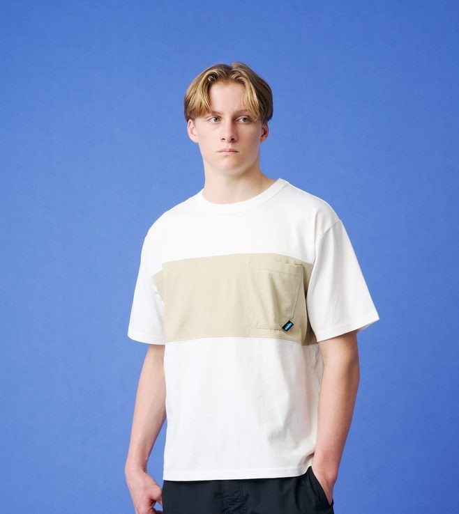 フロントの切り返しが特徴的。切り替えパネルはボディと同一カラー及び大体にチェンジしたバイカラーを用意している。ボックスシルエットのクルーネック Teeはゆったり着られるぞ。