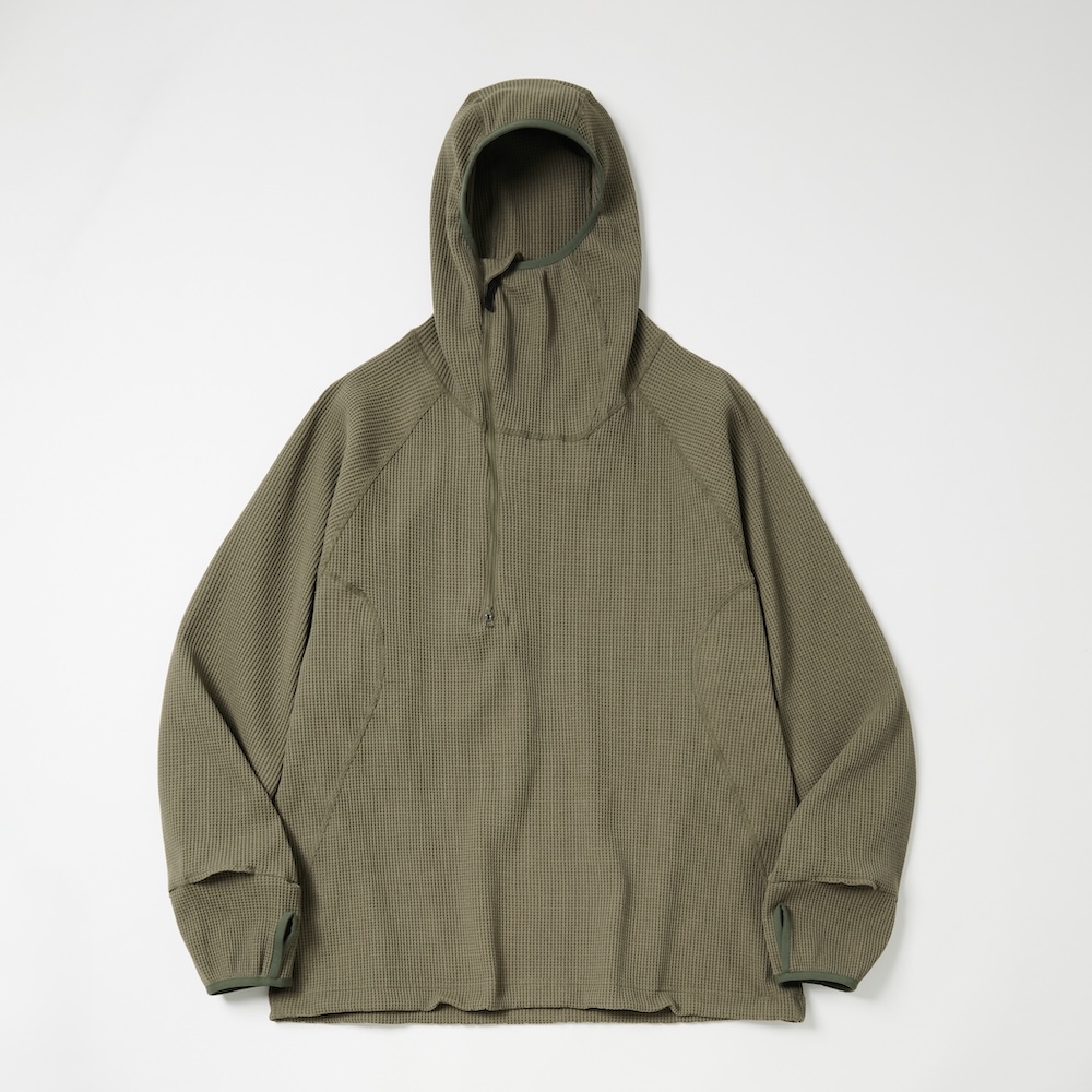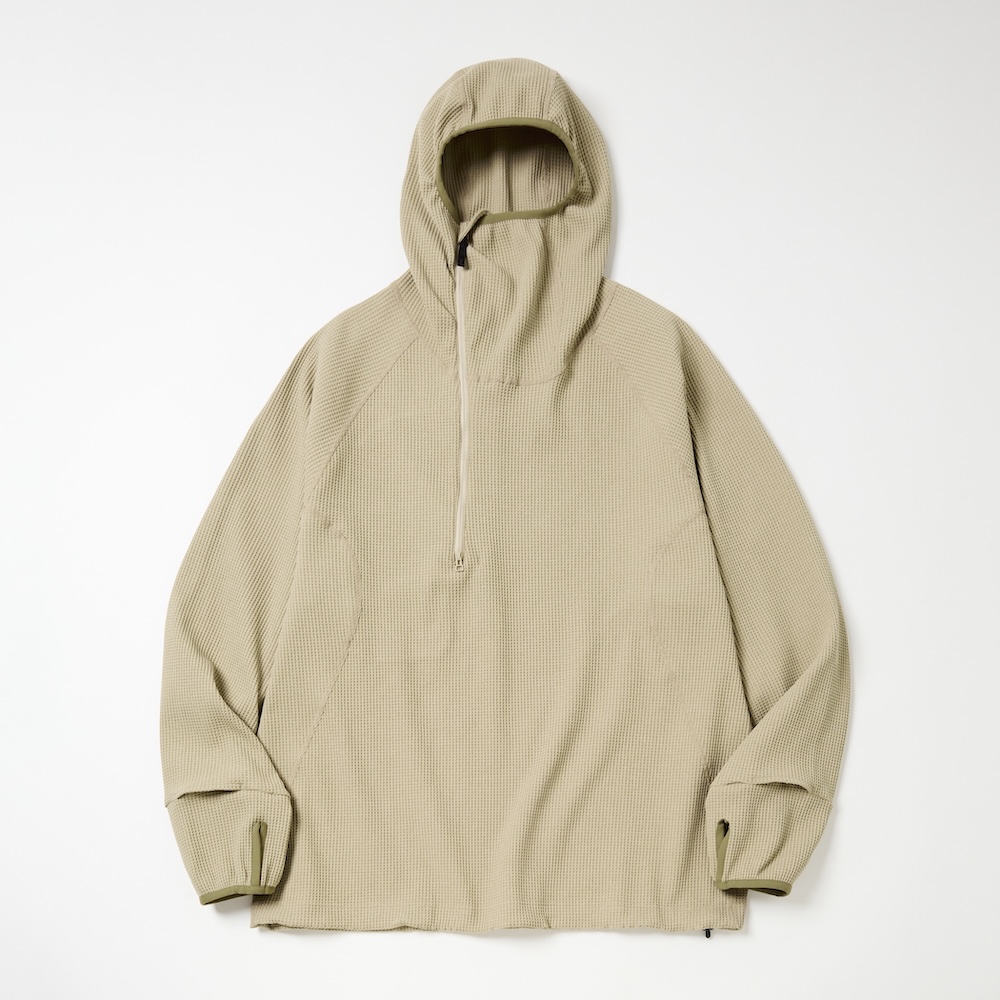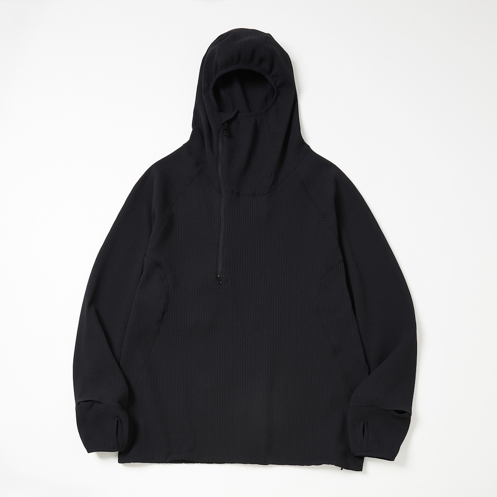 高めの襟によって、バラクラバのようなフードを採用した本作。着脱のしやすさを考慮したハーフジップ仕様で、機能性とデザイン性を両立。素材のカッティングにより、ゆとりのあるサイズ感でありながらもすっきりとしたシルエットに。裾にはドローコードを備え、フィット感やシルエットの調整も自由自在。