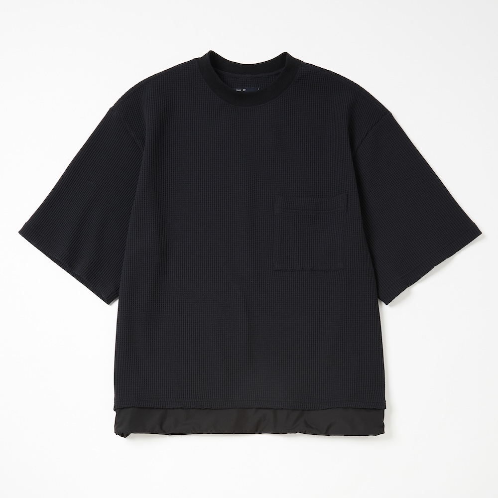 二重の裾の重なりがデザインアクセントになったTシャツ。ゆったりとしたシルエットで、こちらも裾はドローコードにより調節可能です。