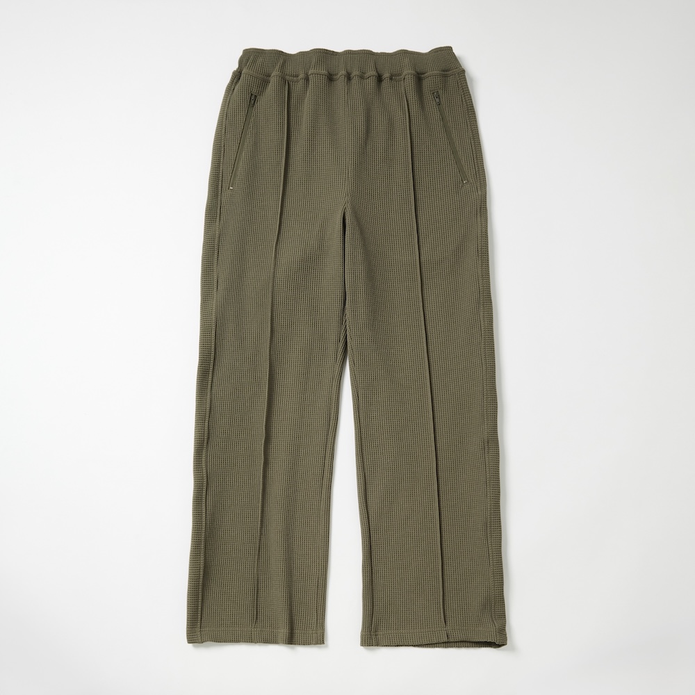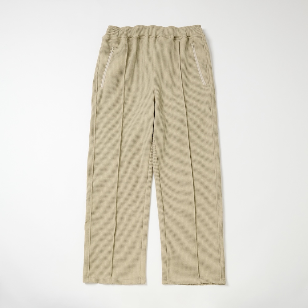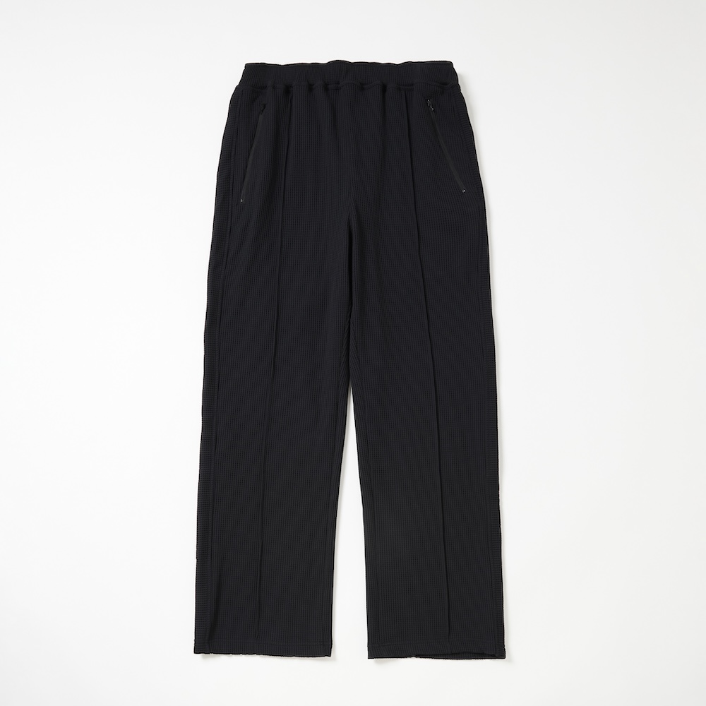 某スポーツメーカーのトラックパンツをリファレンスに、素材使いとシルエットの構築によって匿名性を持たせた一本。ウエストから腰まわりにかけて、程よいフィット感を持たせつつ、深めの股上によってハイウエストでも着用できるバランスに設計されています。