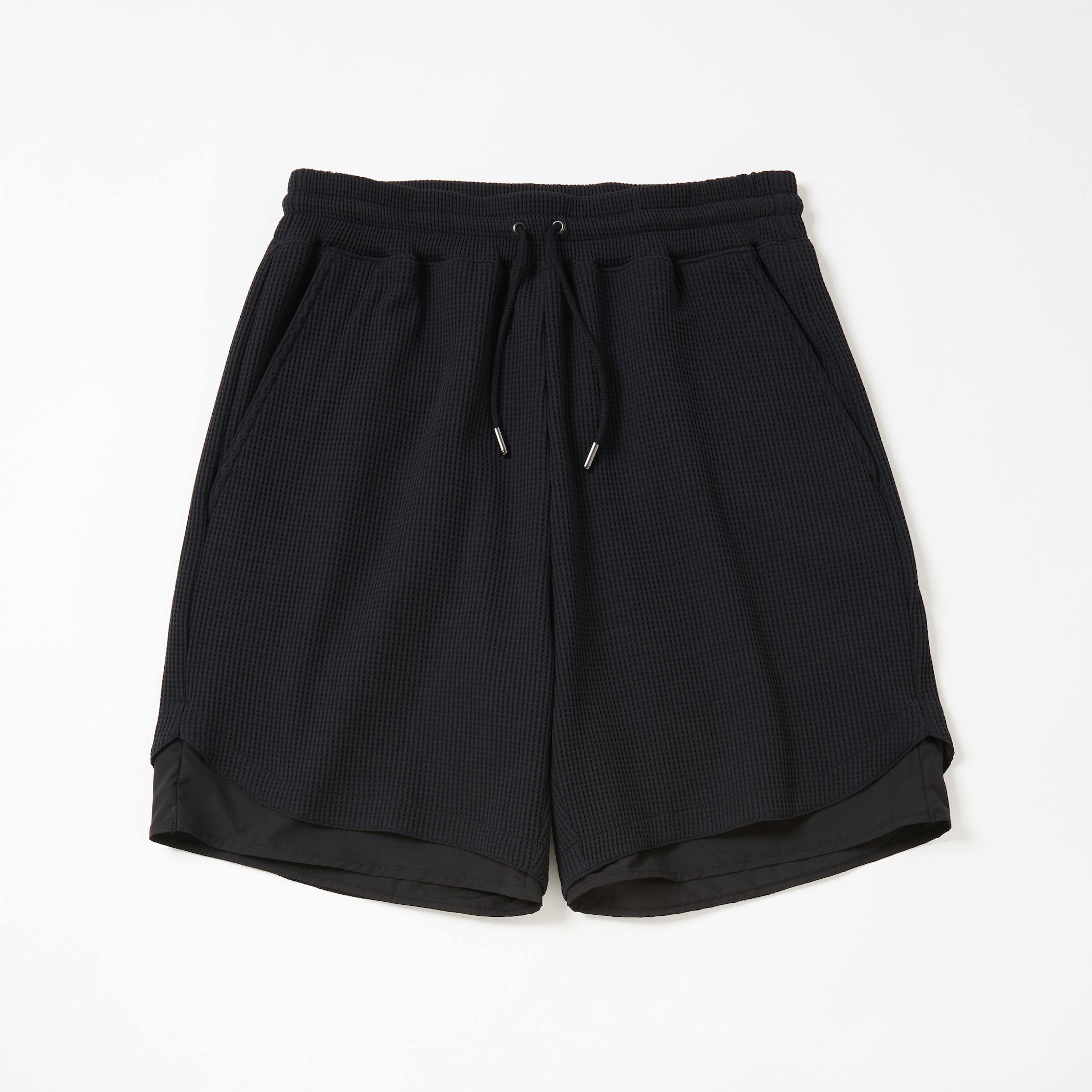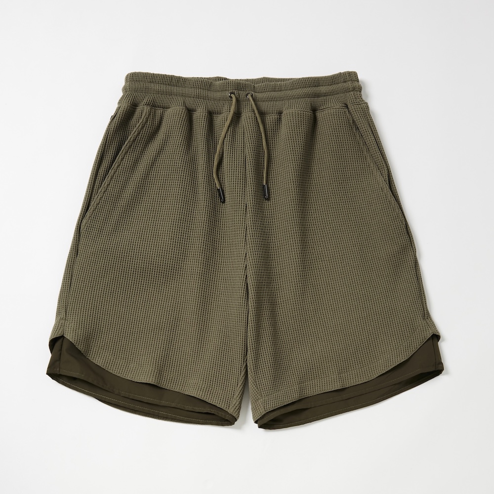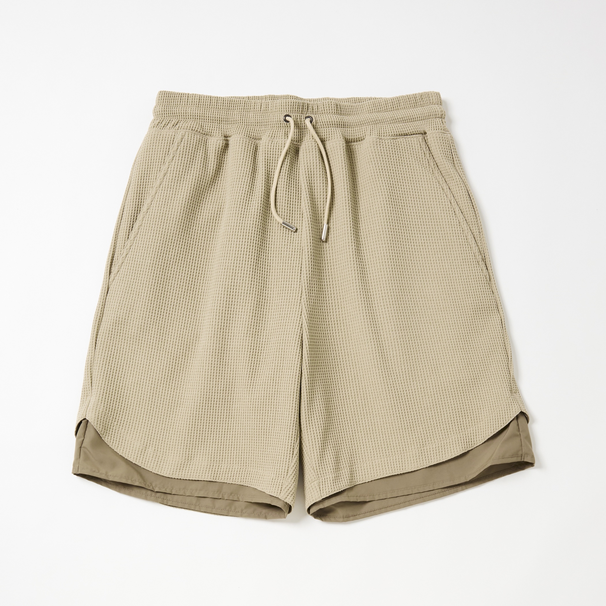 裏地付きの二重構造のイージーショーツ。内側は透湿撥水性の高いポリエステルタフタを使用しているので、汗などの水分を内部から外へ素早く放出し、ムレを抑え快適に保ってくれます。ウエストはドローコード仕様で、右腰にDカン付き。