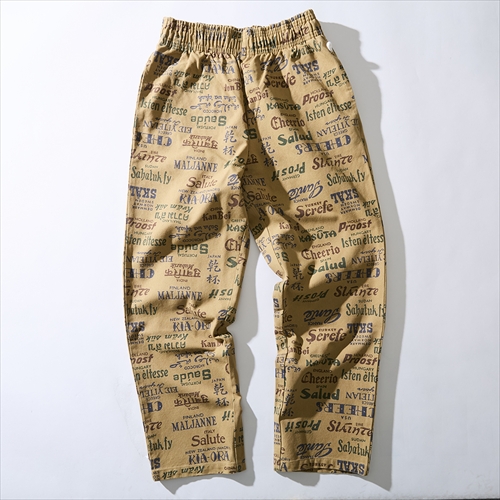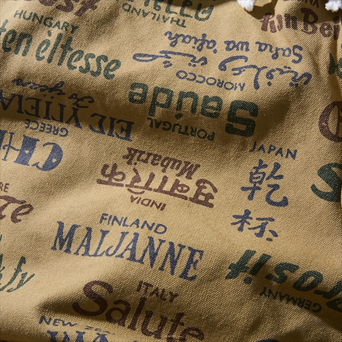 “乾杯”とのレタードをあらゆる国の言葉で散りばめた、お酒好きにはたまらない総柄に。ピグメント染めとハードウォッシュを組み合わせた風合いのある質感。