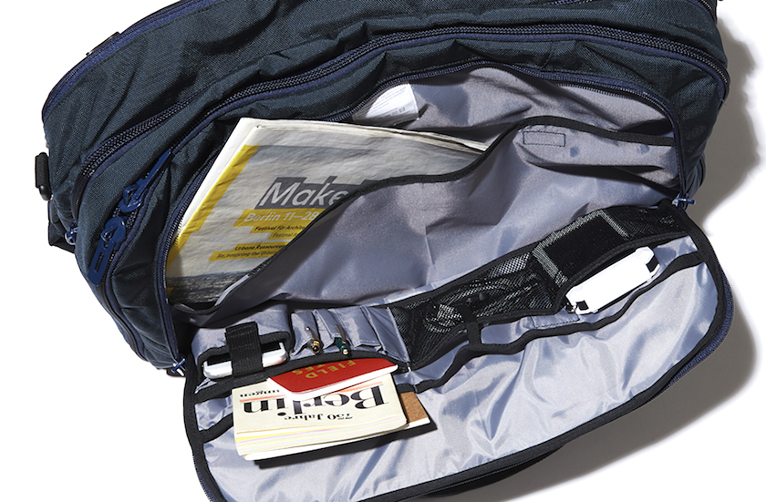 メイン素材にナイロンツイル生地を使用、PVC加工を施すことで耐水性を高めている。負荷のかかりやすい底マチ部分にはコーデュラバリスティックナイロンを採用、耐久性もバッチリだ。さらに、シャツやジャケットなど、身の回りのものを固定して持ち運ぶのに便利なスリングバインダーを備えている。