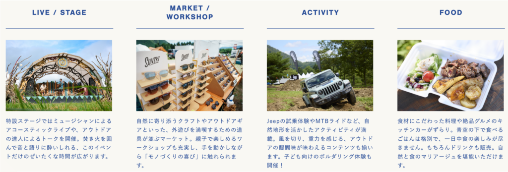 イベントでは、4組のアーティストによるアコースティックライブや、アウトドア好き著名人のトークショー、アウトドアギアやライフスタイルブランドのマーケット、親子で楽しめるワークショップやキッズアクティビティ、各地から選りすぐりフードトラックなどコンテンツが盛りだくさん。