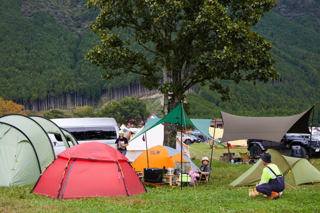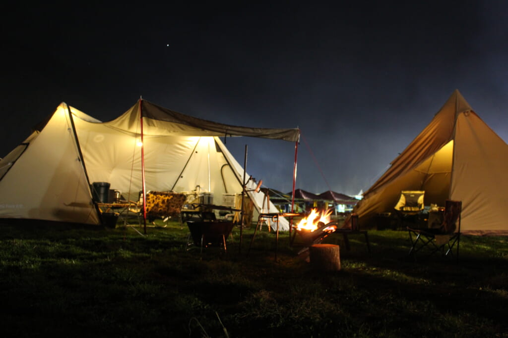 GO OUT CAMP初参加は2018年。そこで失敗したと思ったのは設営場所だったそう。「トイレとステージが遠くて、移動が大変だったんです。その次は反省を生かしてステージ近くに建てたら、やはり音が気になってしまいました。音楽は楽しめましたが、小さいお子さんがいる方や、ゆっくり過ごしたい方は少し離れた場所の方がオススメですね」。