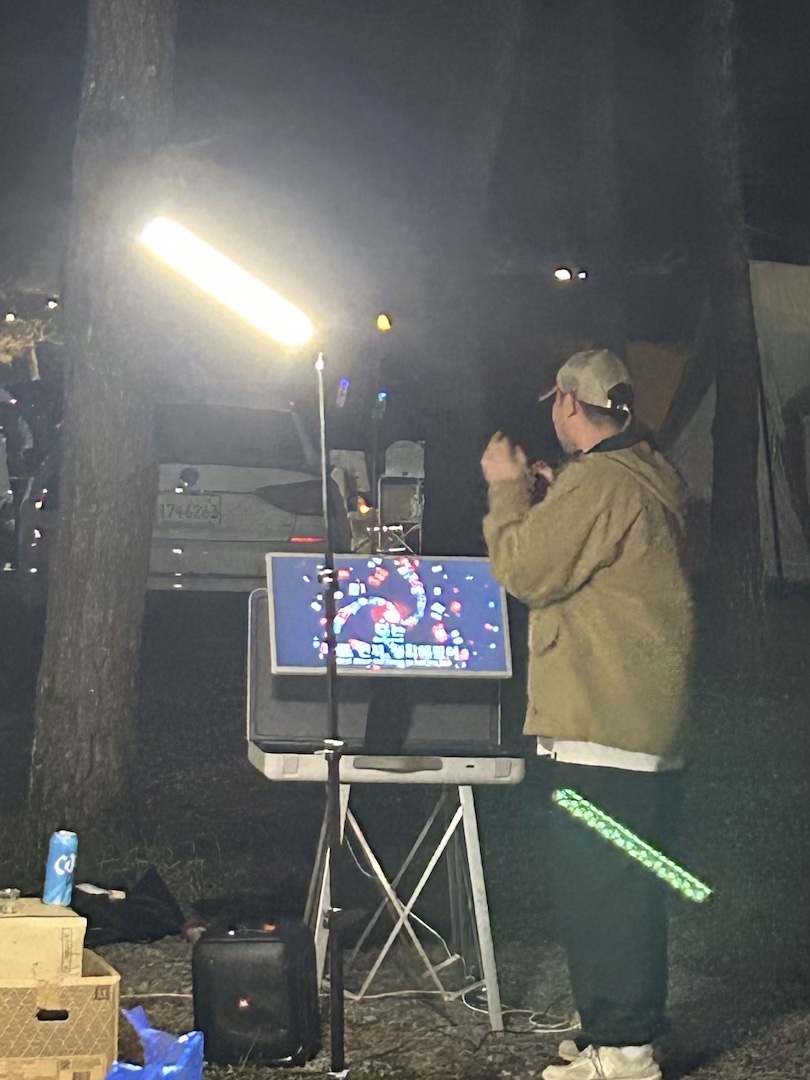 なんとカラオケを持ち込んで熱唱! 実はテントサイトを巡っているとあちこちのテントでモニターを持ち込んでいる人が多数いました。みなさん、昼のまったりした時間にネトフリなんかを見ながら過ごされていましたよ。ちなみにGO OUT KOREA CAMPでは各サイトに電源が供給されるんです。それにしてもこのカラオケモニター、ジェラルミンケースと一体型の持ち運び専用モデルになってませんか?