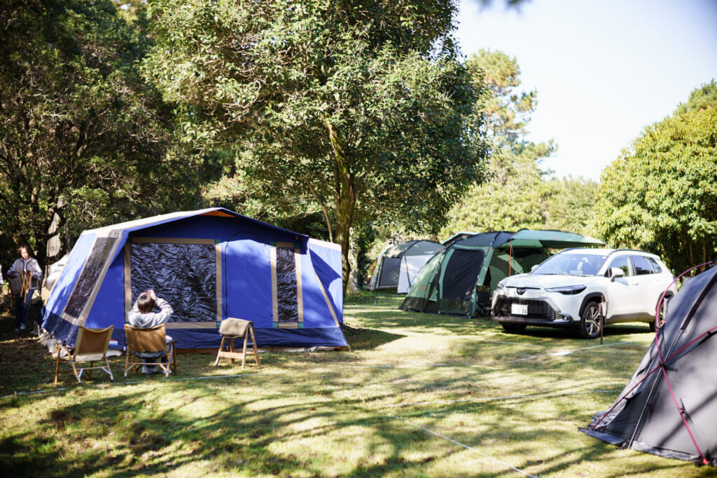 普段はフリーサイトのキャンプ場は、イベント時は特別に区画サイト仕様に変更。約10m × 10mと広々スペースで大型テントとクルマを入れてもゆとりがあり、キャンプも存分に楽しめるようにという配慮を感じます。