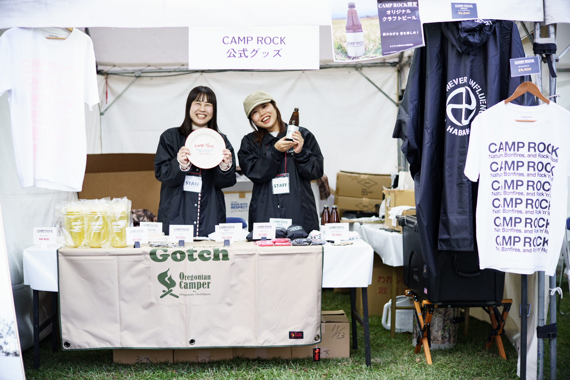 CAMP ROCKはイベントグッズが非常に豊富。定番のTシャツをはじめ、レインポンチョ、リストバンド、クラフトビールなど、さまざまなアイテムがラインナップしていました。