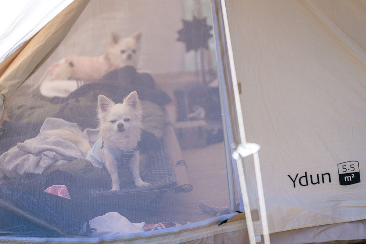 GOJが開催される4月のふもとっぱらは、平均気温9.6℃、最低気温4.5℃、最高気温15.8℃。4月とはいえ、夜はまだまだ冷え込むので防寒対策にも気を抜けない。フロアに底冷え防止のカーペットなどを敷き詰めたお座敷スタイルなら、冷え込みが厳しい夜などは室内に篭って、ストレスのない広々とした空間でくつろげる。