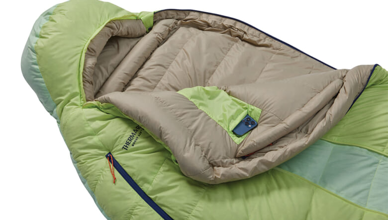 シュラフ内にも小物を挿れるポケットが。スマホなどの機器は、低温によりバッテリーの保ちが悪くなるので、これは地味に便利なギミックだ。