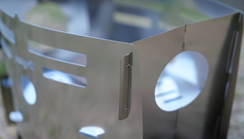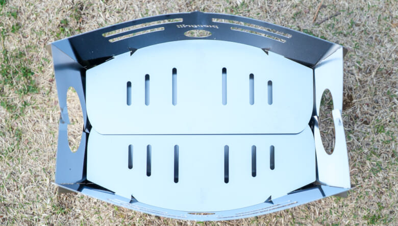 展開はほとんど一瞬。広げるだけで火床も灰受けも備えた、箱型の焚き火台が出現する。構造の見事さは感動レベルだ。
