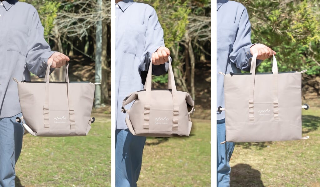 アイスコンテナに続いては手軽なクーラーバッグも見逃せない! こちらは容量 5Lと 10Lの 2サイズでリーズナブルな価格も魅力的なうえ、写真のようにボックス型、トート型、収納型(フラット)の3型に変形できる優れもの。
