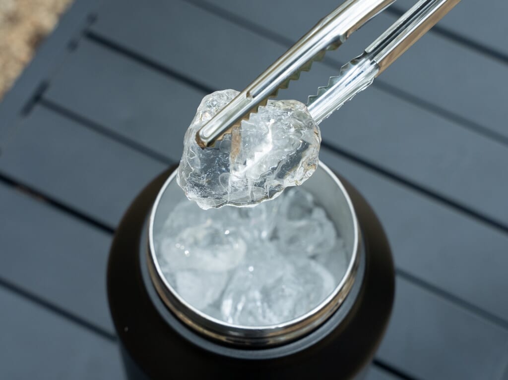 間口は85㎜サイズと広めなので、スーパーやコンビニなどで売られているロックアイスもOK! 注目の保冷力については、外気温35度で約1/4の氷を入れた状態で試したところ、2Lタイプだと約24時間以上、3.8Lタイプなら32時間以上も氷の原型を保っていた模様。