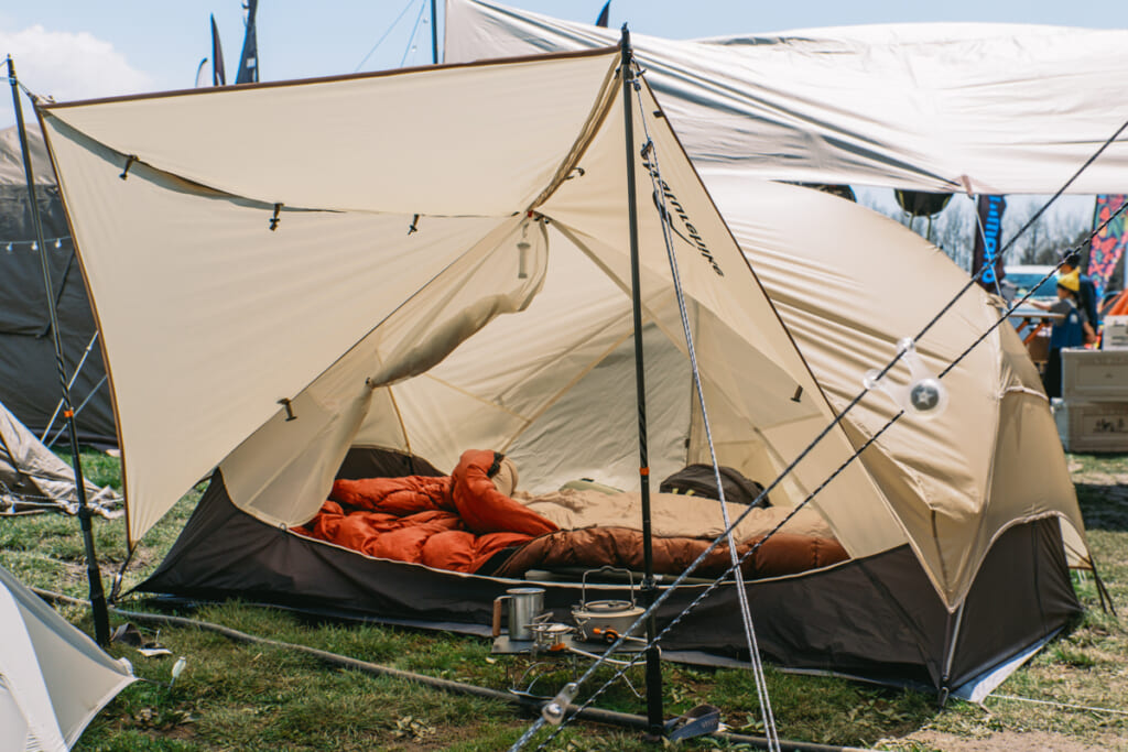 ふらっと立ち寄ったブースで目に留まった2張りのテントは、どちらも見た目はシンプル。だけど、よく見ると細かな工夫があちこちに散りばめられていて、思わずじっくり見入ってしまった。