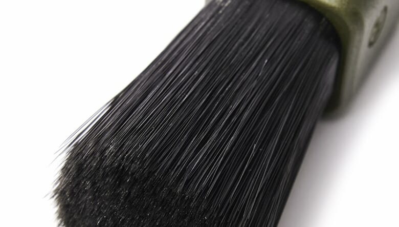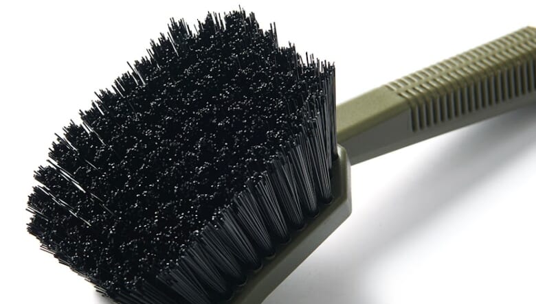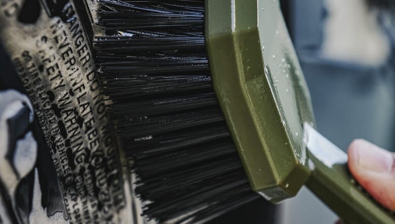 タイヤ周り用のブラシは硬くてタフな合成毛を採用。トレッドの隙間に入り込んで頑固な汚れを取り除ける。