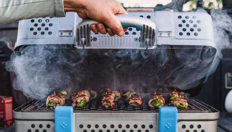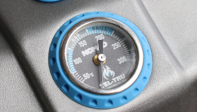 使用時には、スーツケースと同じように開いてセットする。ピタリと収まるグレート(焼き網)が1枚付属し、その上で食材を焼けるのはもちろんのこと、ケースを閉めることでスモーカーとしても使用可能。温度計が埋め込まれているので、温度管理もラクラクだ。
