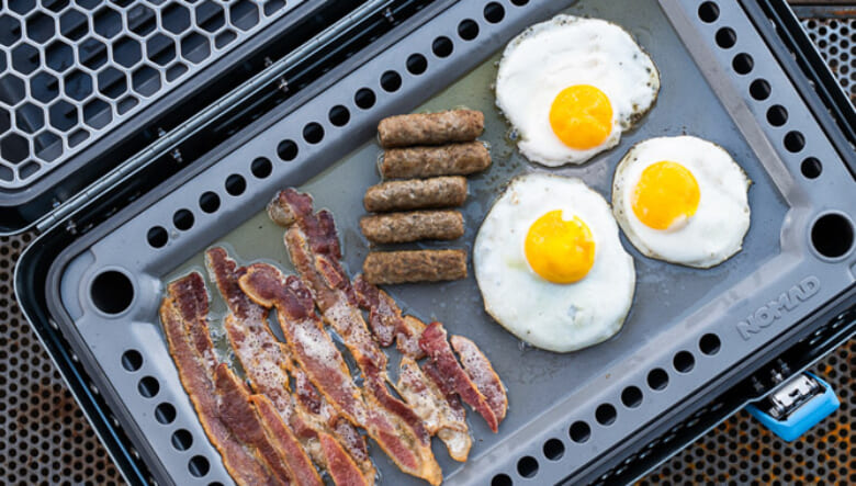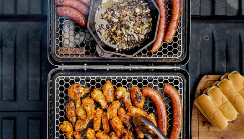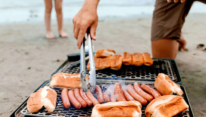 調理スペースの面積的には、画像の1面使用でハンバーガーのパティを約15個焼ける。4名程度のグループなら余裕だろう。それよりも大人数になる場合は、別売りのグレートやグリドル(鉄板)を追加することで、調理スペースを2面にすることもできる。