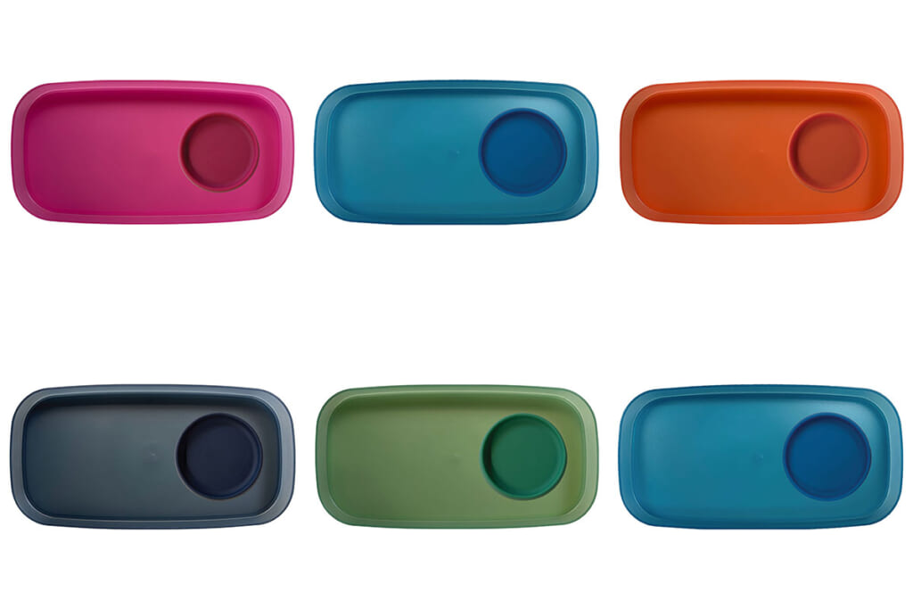 サイズは長方形のアペタイザートレー(W356×D178×H36mm)と、正方形のディナートレー(W241×D241×H36mm)の2種類。カラーはどちらもピンク、ティール、テラコッタ、ブラック、セージ、ネイビーの全6色とカラフルな展開になっているので、ホームパーティーを彩るのに最適なアイテムだが、実はアウトドアでも便利なポイントが多い。