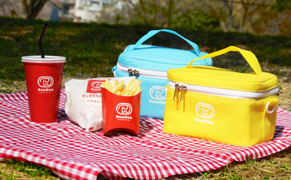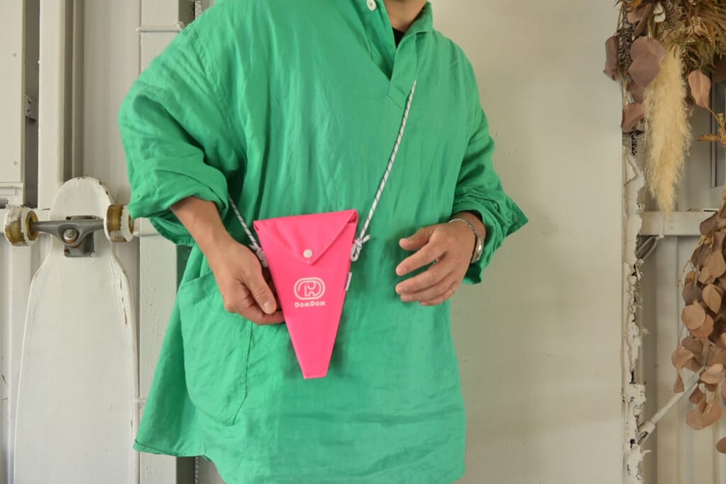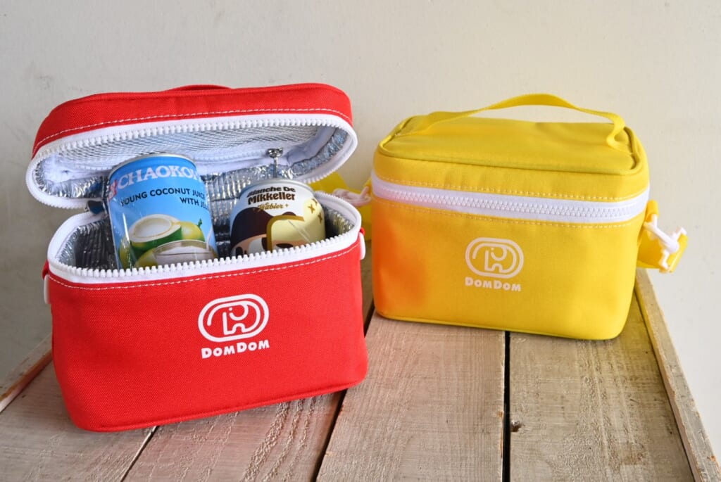 カラーはレッド、ブルー、グリーン、ピンク、イエローのカラフルな5色で、ドムドムハンバーガーのブランドロゴとして親しまれている“どむぞうくん”をデザイン。本体と同色の専用ショルダーベルトが付属するから手持ち、肩掛けの2WAYで使用可能。