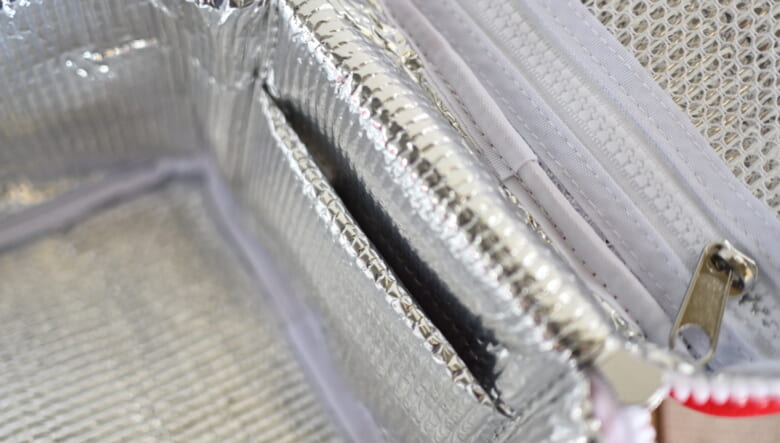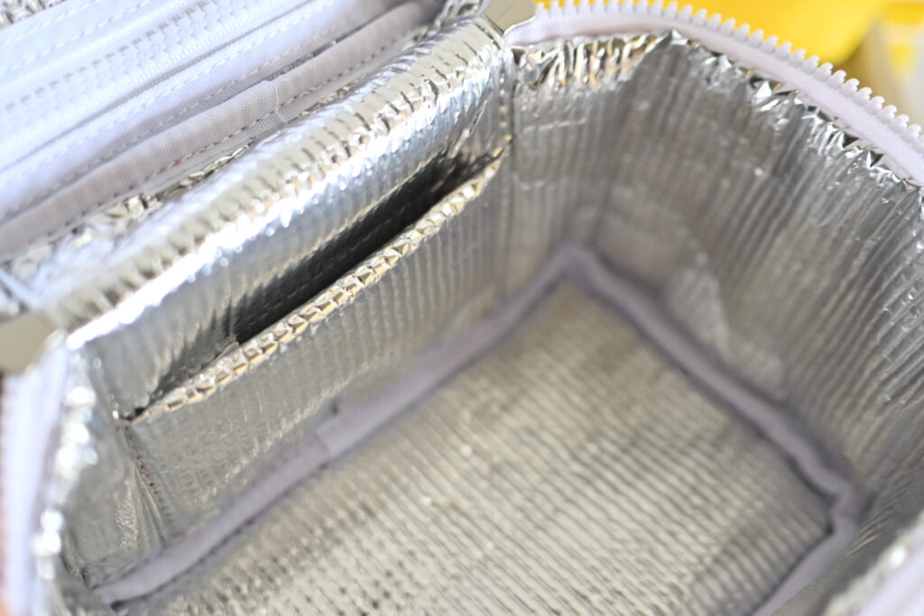 内部はアルミ仕様でしっかりと保冷or保温でき、カバー裏にはカトラリーなどに最適なメッシュポケットが、そしてメイン部分には小さい保冷剤用のポケットがあるのがうれしい!