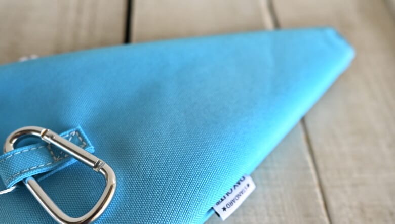 スナップボタンのフラップカバーを備え、カラビナや脱着式のストラップが付属するからベルトループやバッグに掛けたり、そのままポーチとして利用できる。