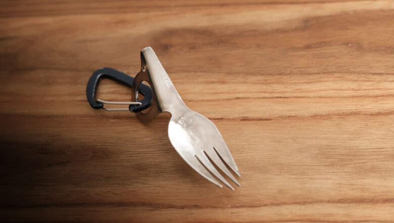 カラビナを使えば吊り下げて携行することが可能。バックパックへの吊り下げは、当該アイテムのビジュアルにもこだわりたいところだが、このフォークなら満点レベルで味がある。