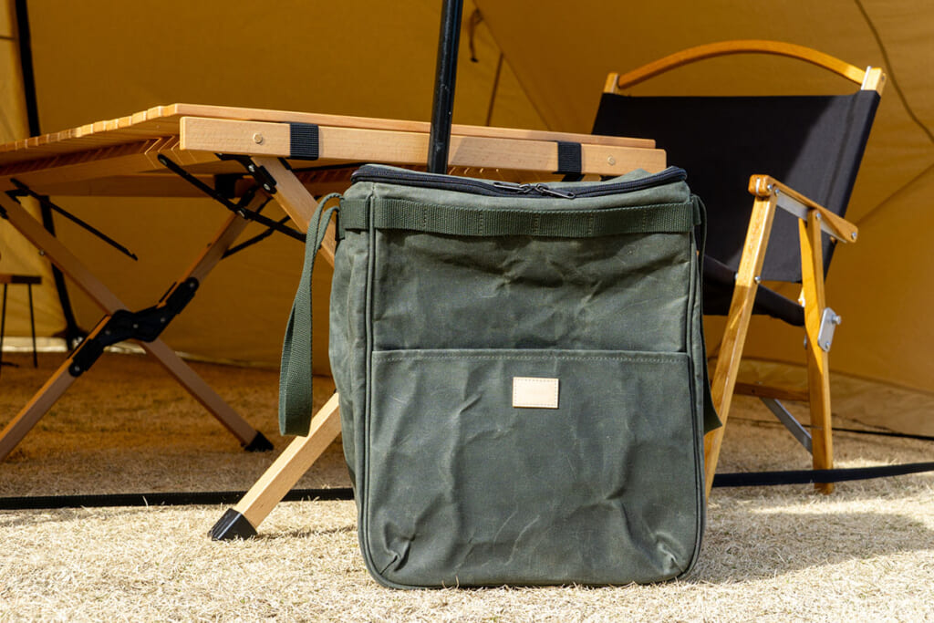 「アソビト」の“キャンプのごみ箱”は、パラフィン加工された防水帆布を使ったキャンプ用ゴミ箱で、カラーはオリーブのみ。樹脂や金属を使わずに布地のみでできているので組み立ては不要。ごみ袋を捨てたあとは折りたたんでコンパクトに収納が可能だ。