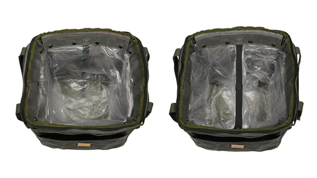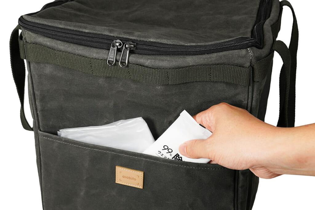 底面には汚れをサッと拭き取れる耐水性の高いターポリンを採用。予備のゴミ袋やウェットティッシュを入れられる正面ポケットも備えている。