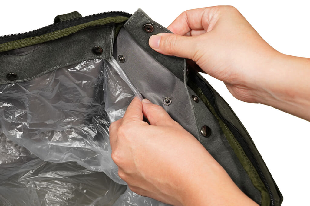 ゴミ袋の取り付けは、スナップボタンで挟むだけと簡単だ。
