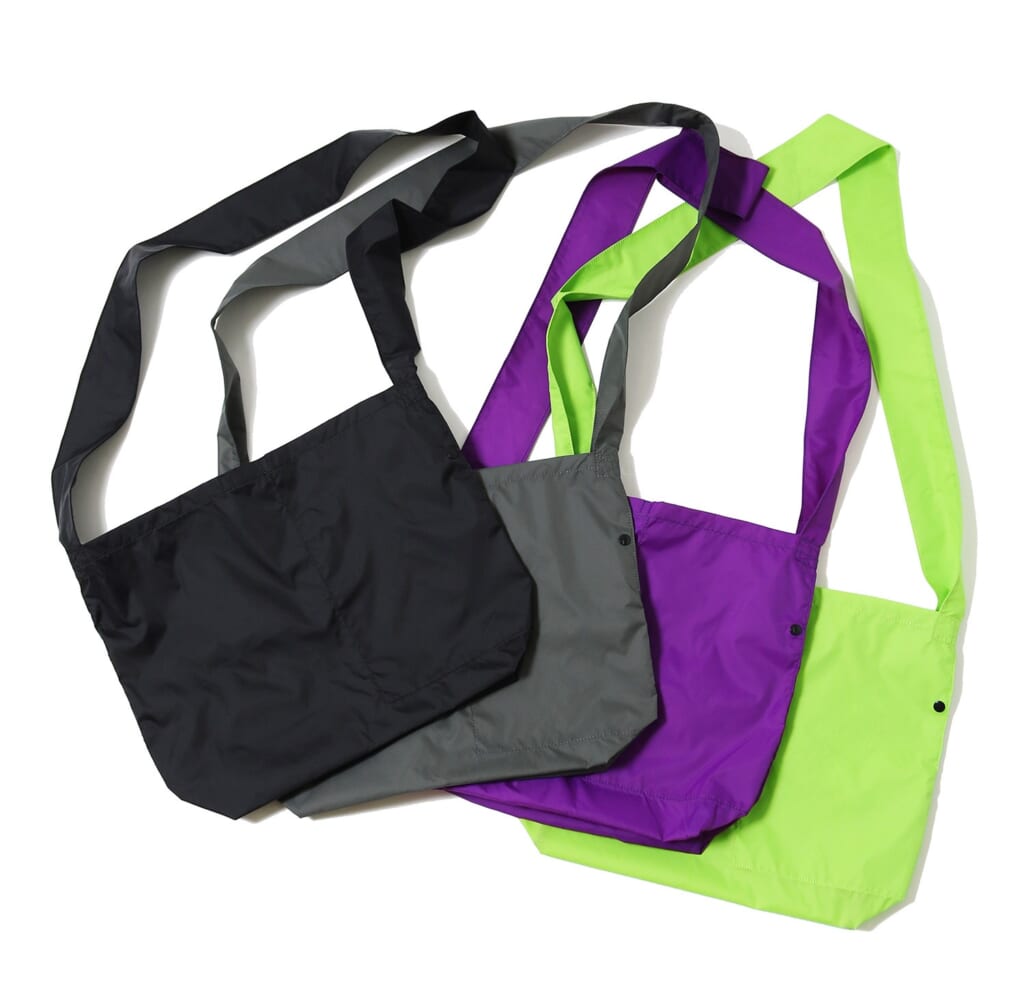 普段使いや旅行などに重宝するショルダーバッグは210デニールの軽量なリップストップナイロンを使用。スナップボタンのサイドポケットには小物を入れることもでき、本体自体を収納して”パッカブル“仕様にもなる手軽さが魅力なのだ。