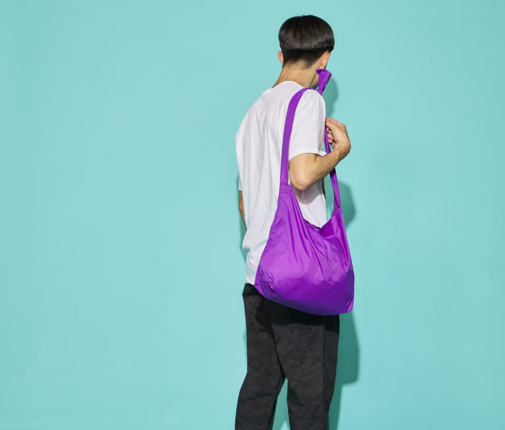 またショルダーストラップは132cmと長めに取り、結ぶことでサイズ調整も可。カラバリはブラック、ブリンドル(グレー系)の落ち着いた色合いのほか、パープルとライムのポップなカラーを追加した計 4色展開。