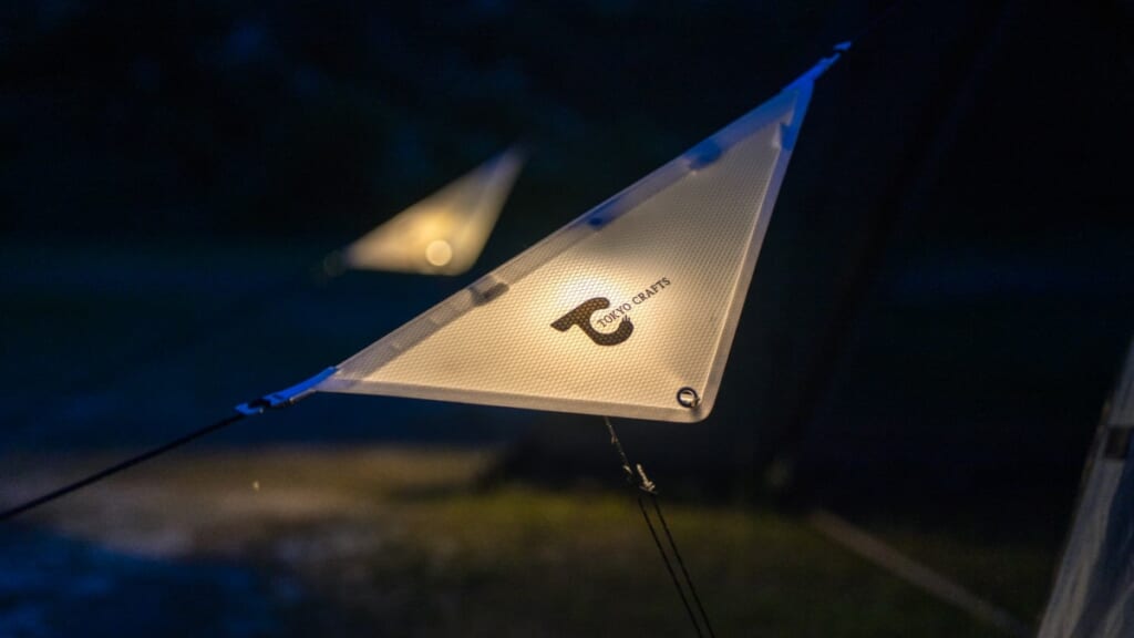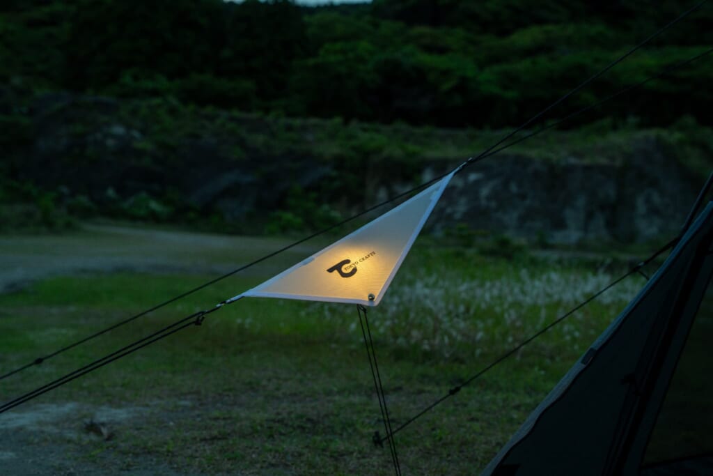 夜のガイロープの視認性を上げるアイテムの中でもとにかく目立つのがルミセイル。本来ロープにつまづいて転んじゃうなんていうキャンプあるある解消のためのものだが、サイトをライトアップしておしゃれも担保するのがこいつのいいところ。