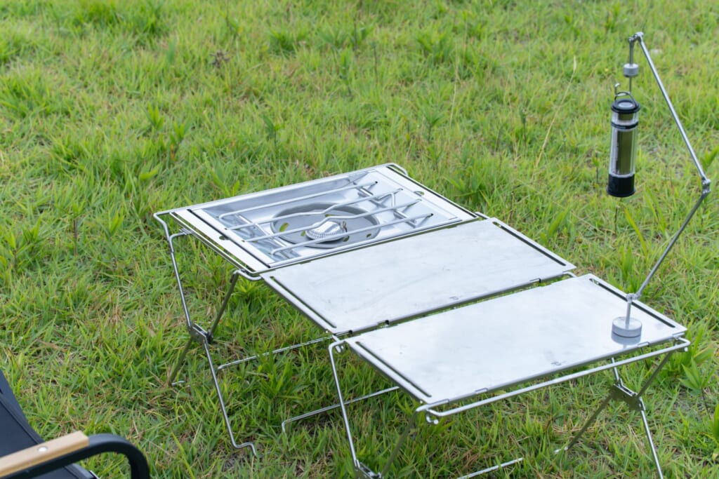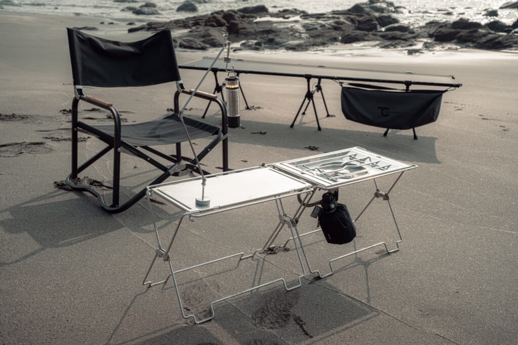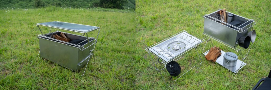 単体でギアケースとして使用するもよし、テーブルトップの下に配置したり、2段使いもできてしまう優れモノだ。ステンレス製で強度があるのでガシガシ使えるのも嬉しいポイント。