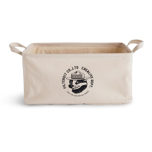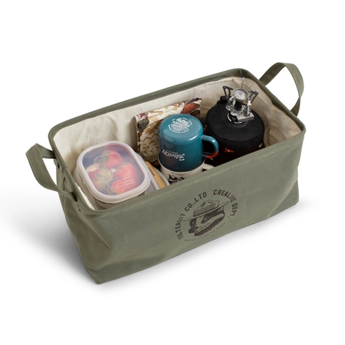 肉厚のある帆布素材とキャラクターのプリントにより、ミリタリーの収納アイテムを思わせる無骨な佇まいに。自宅では雑貨類、キャンプでは荷物の置き場として活躍しそう。