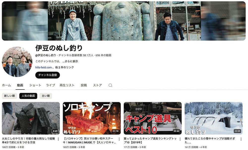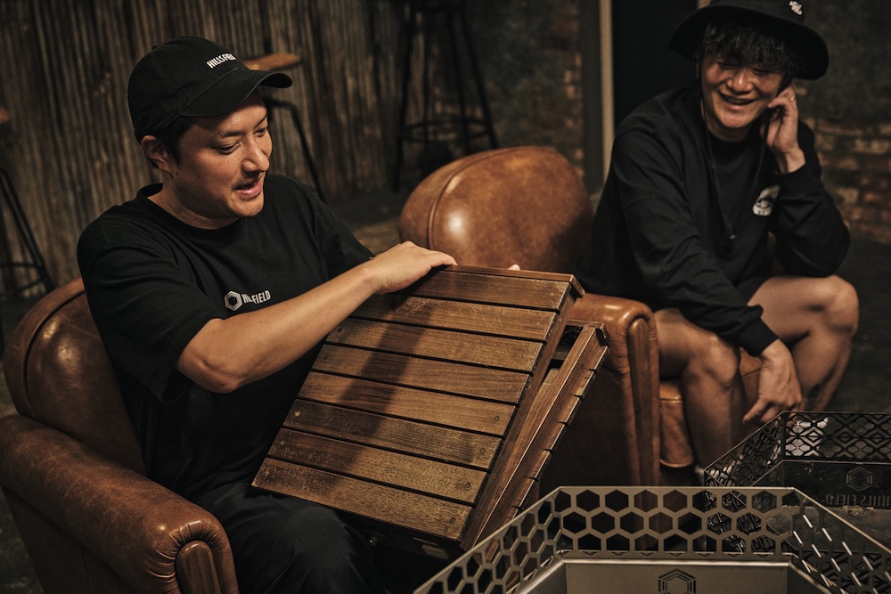 登録者数58万人のYouTubeチャンネル『伊豆のぬし釣り』を運営する、 キャンプとお酒が大好きな二人(けんいち&やまと) に会いに静岡へ。配信と並行し展開されてきたブランド「ヒルズフィールド」は、 焚き火台やビールグラス、 テーブルなどを次々に発売し、 卸店舗は120以上に。そんな大人気の彼らになぜ今会いに行ったのかというと、 今年6月27日から開催された東京アウトドアショーでの群を抜いた集客力が目に留まったから。約6年の歩みから今回満を持してリリースしたソロテントをイベントに合わせて販売し、見事に大ヒットとなったのだ。初期ロッ