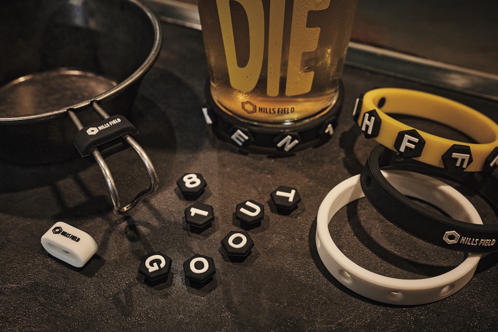 同じグラスや缶ビールなどが並ぶキャンプシーンでも各々が間違わないように、さまざまなグラスやシェラカップに取り付けられるドリンクIDを製作。伸縮性のあるシリコンバンドに、別売りのカスタムパーツ、アイドッツを用いてイニシャルなどをデコレーションしていく仕組み。ジブンの名前にするも良し、その場で閃いたあだ名にするも良し。