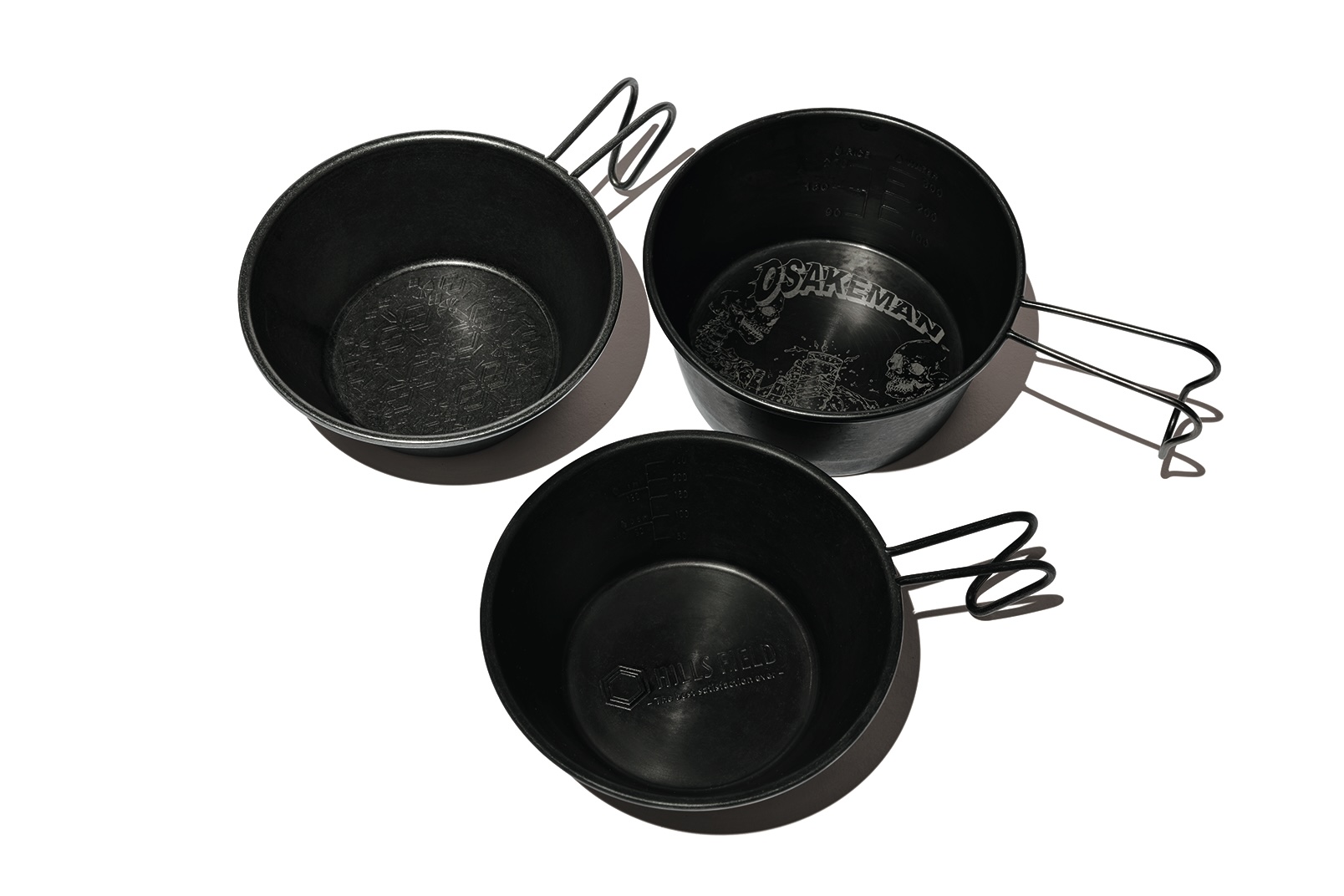 色落ちせずサビに強い黒酸化加工のシェラカップ。ブランド定番のOSAKEMAN柄を施した深型480mLと、330mLサイズはヴィンテージ加工のYAMATO柄とロゴの2タイプを用意。